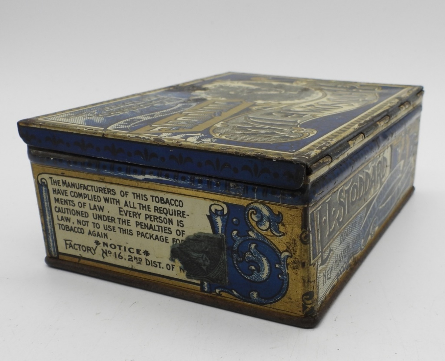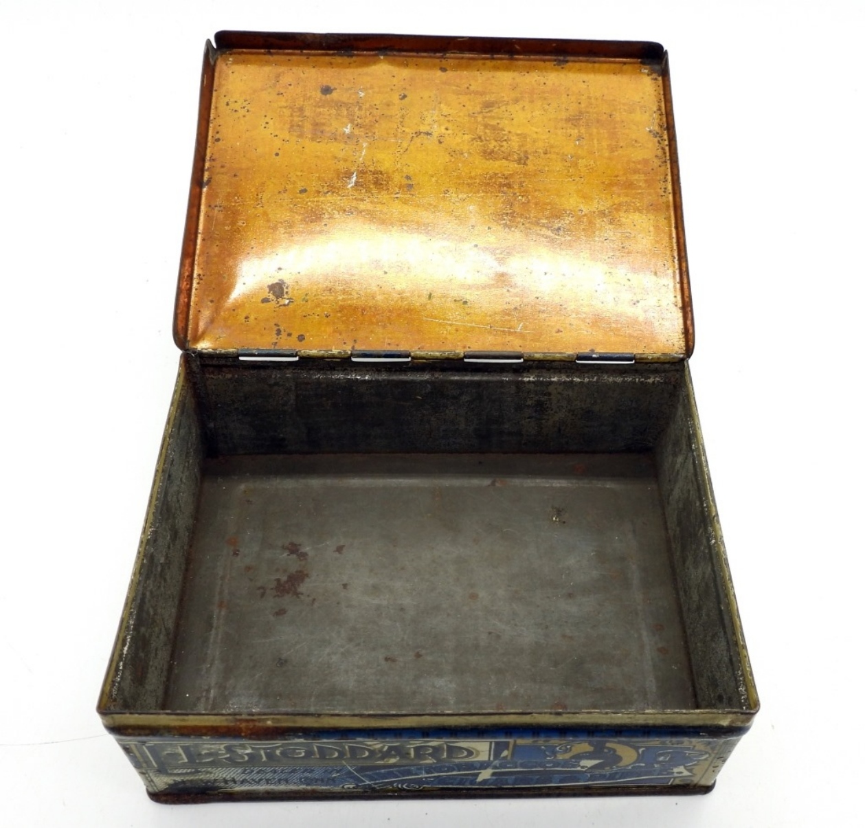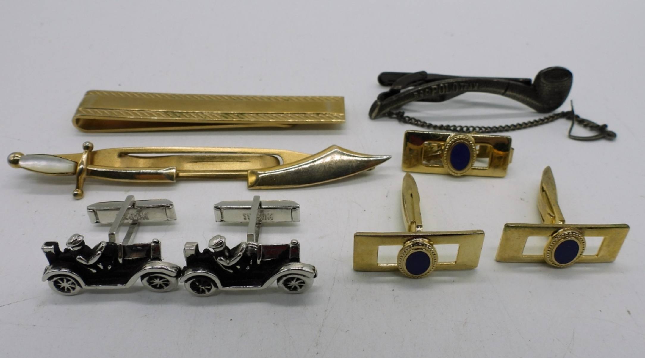 C.1900 HANDSOME DAN STODDARD CO. TOBACCO TIN WITH 2 PAIR OF CUFFLINKS AND 4 TIE CLIPS INSIDE. TIN MEASURES 4.5 x 3.5