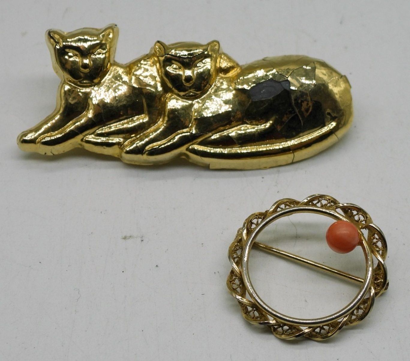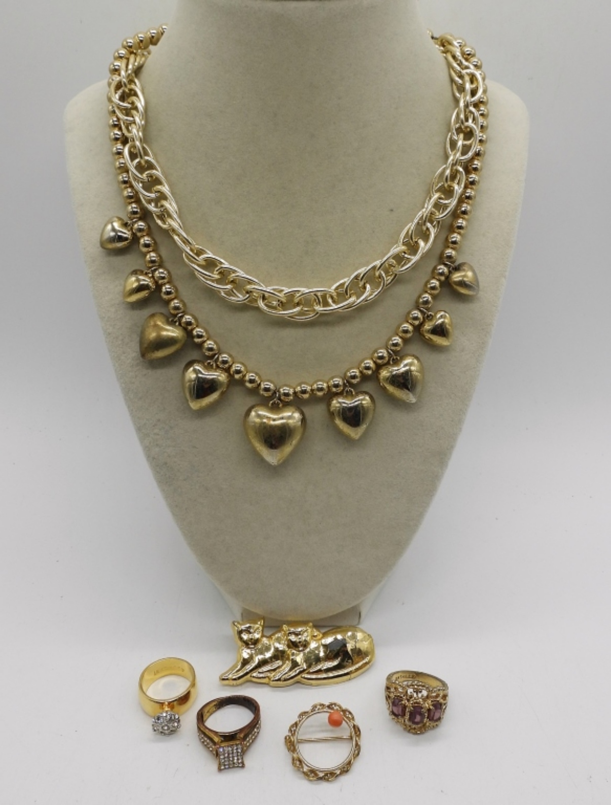 TWO GOLD TONE FASHION NECKLACES, 17.5″ & 19.5″. THREE GOLD TONE FASHION RINGS, SIZES 5, 6, 8. TWO BROOCHES.