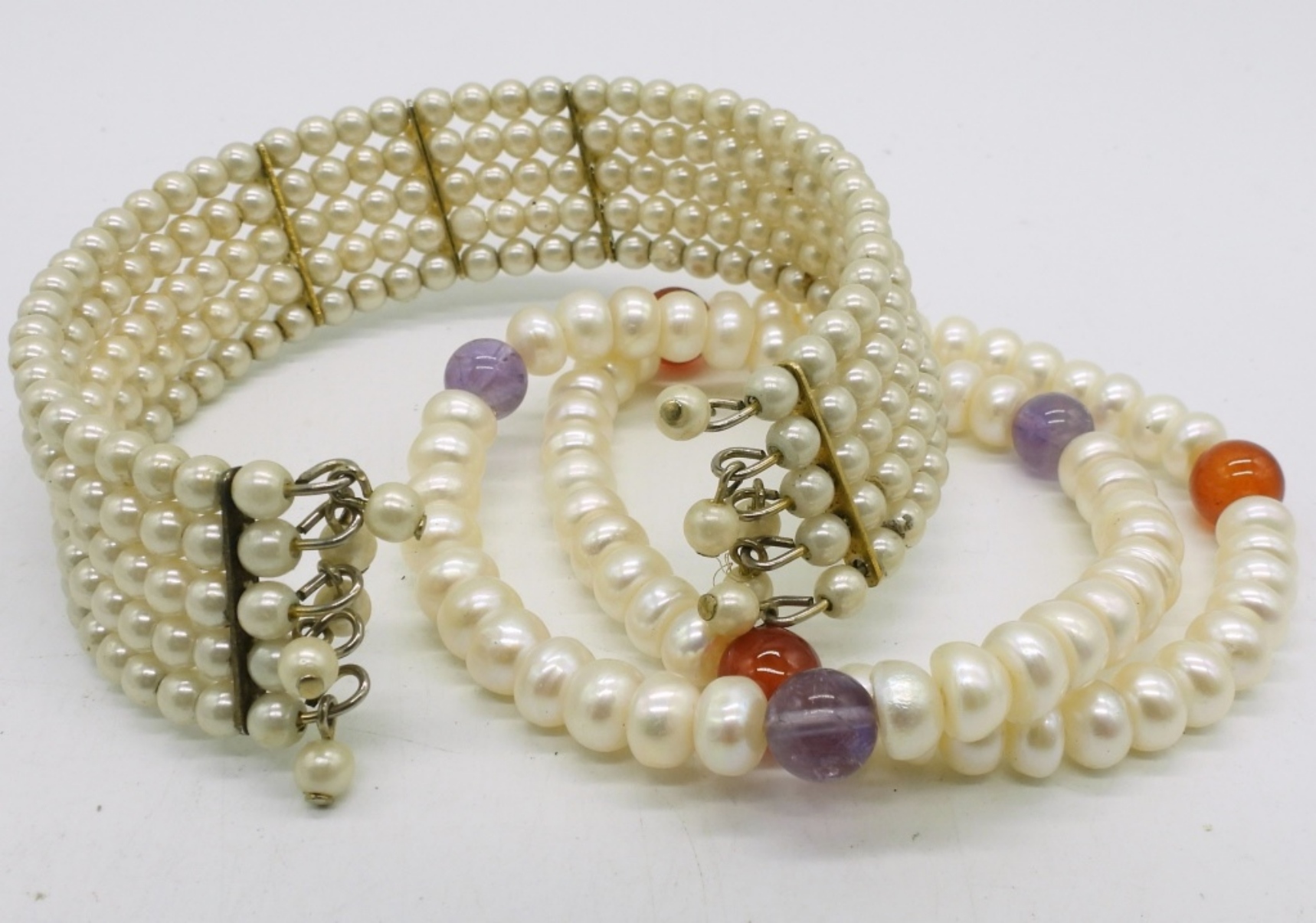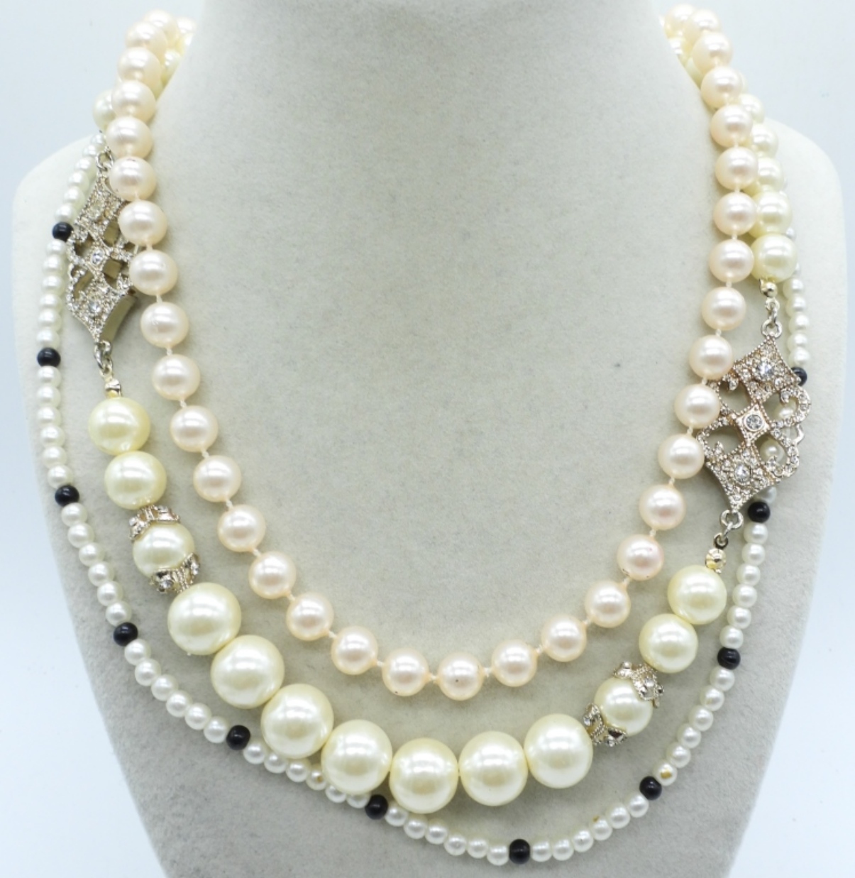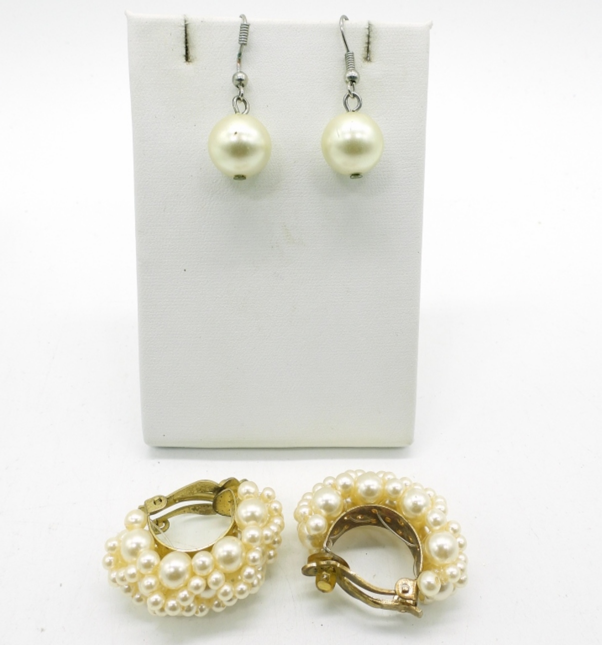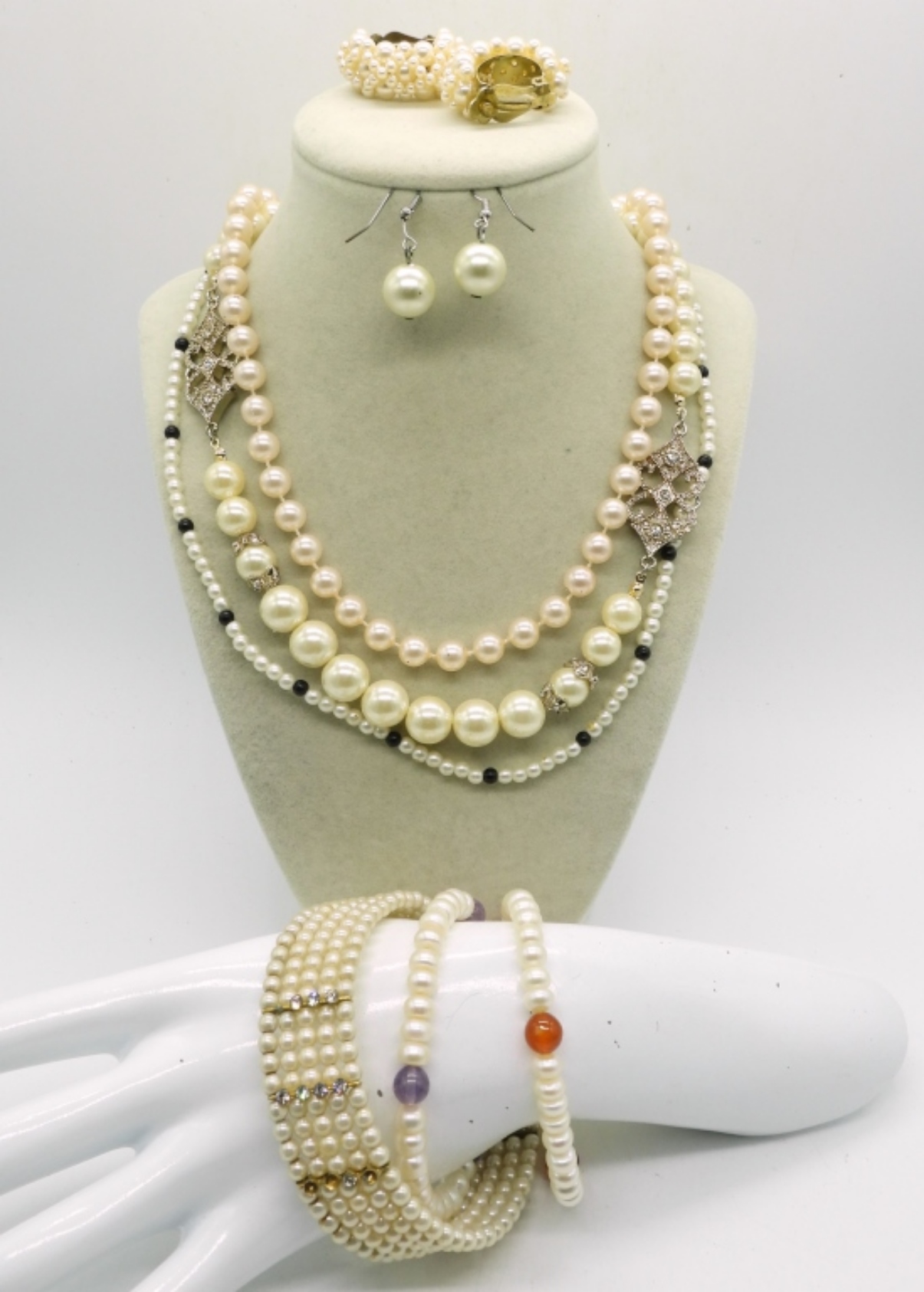 3 FASHION PEARL NECKLACES, 18 & 20″. 3 FASHION PEARL BRACELETS. TWO PAIR OF FASHION PEARL EARRINGS, CLIP ON AND PIERCED.