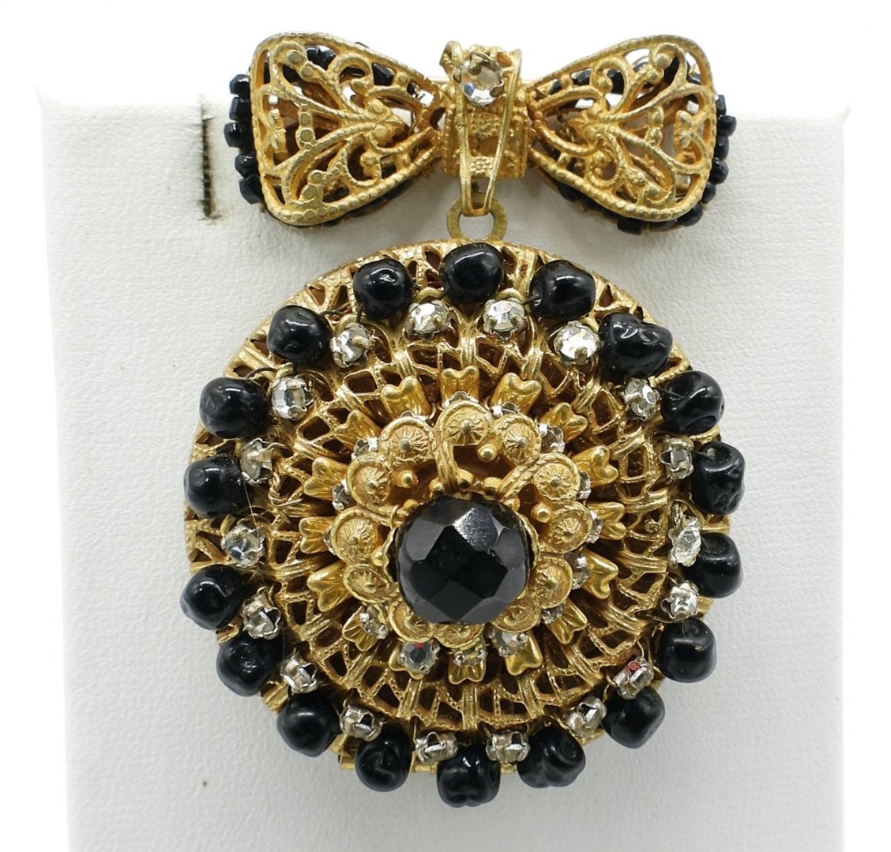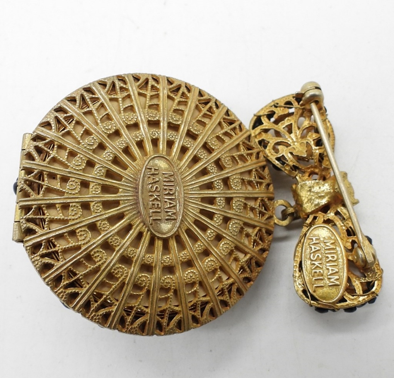 MIRIAM HASKELL RUSSIAN GOLD TONE GILT LOCKET BROOCH. SIGNED IN TWO PLACES “MIRIAM HASKELL”. 2″ LONG. FULLY INTACT! GREAT FIND!!