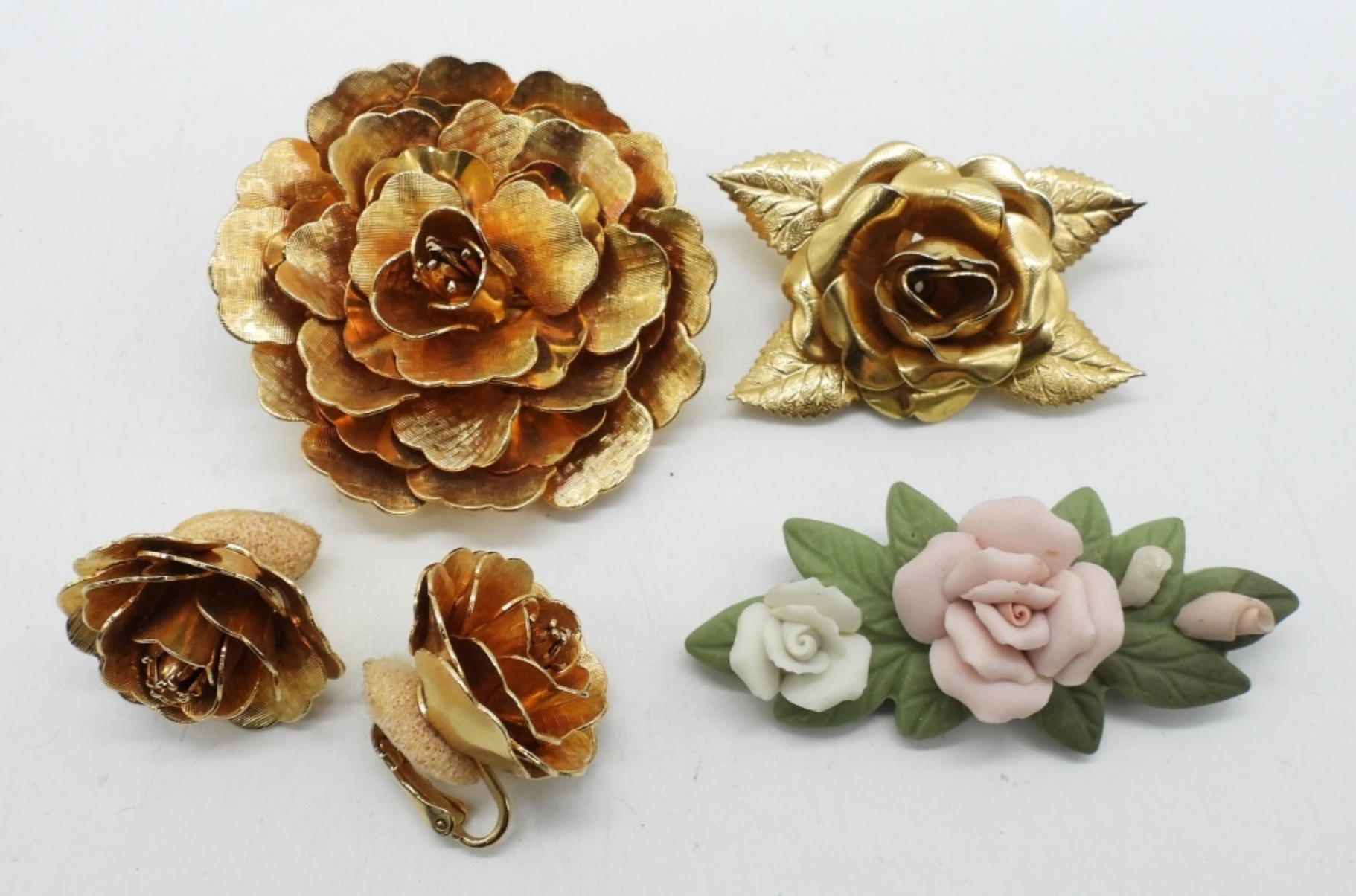 MATCHING GOLD TONE ROSE BROOCH & CLIP ON EARRINGS. (2″ & 1″). ROSE & LEAF GOLD TONE BROOCH, 2″ & A PINK & WHITE ROSE BROOCH, 2.5″.