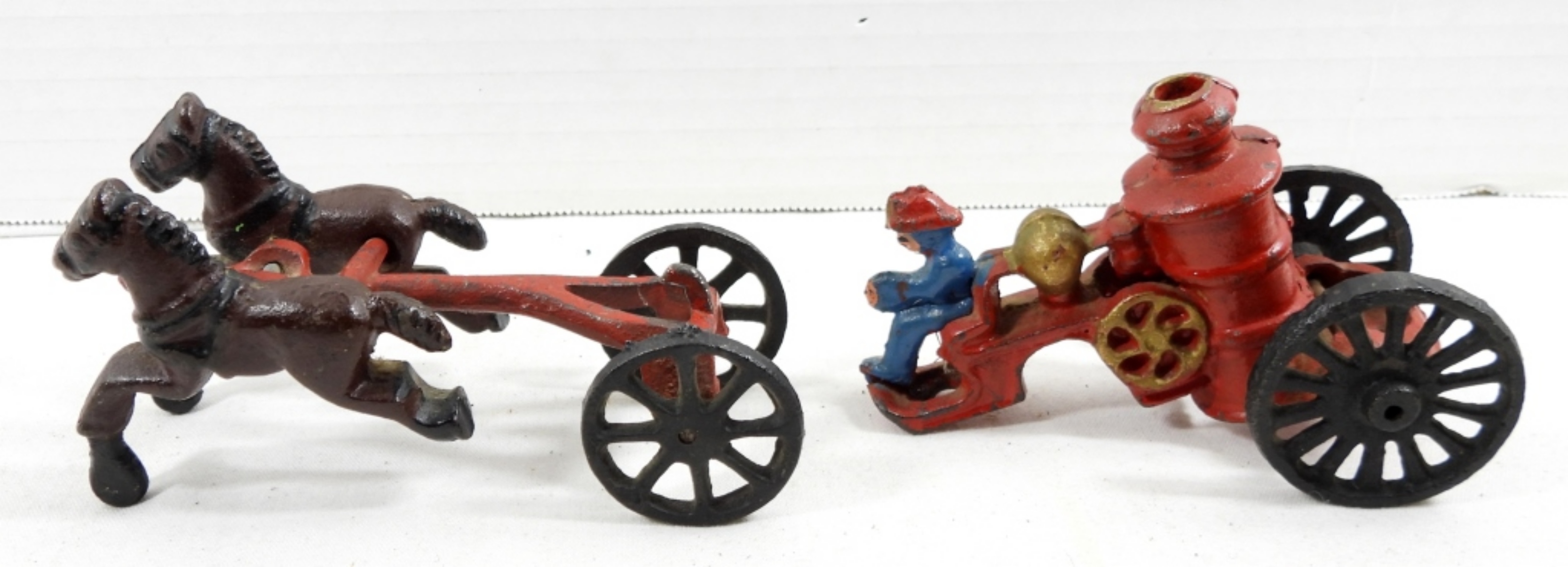 VINTAGE CAST IRON FIREMAN FIRE PUMPER WAGON HORSE DRAWN FIRE TRUCK TOY (2 PIECE )