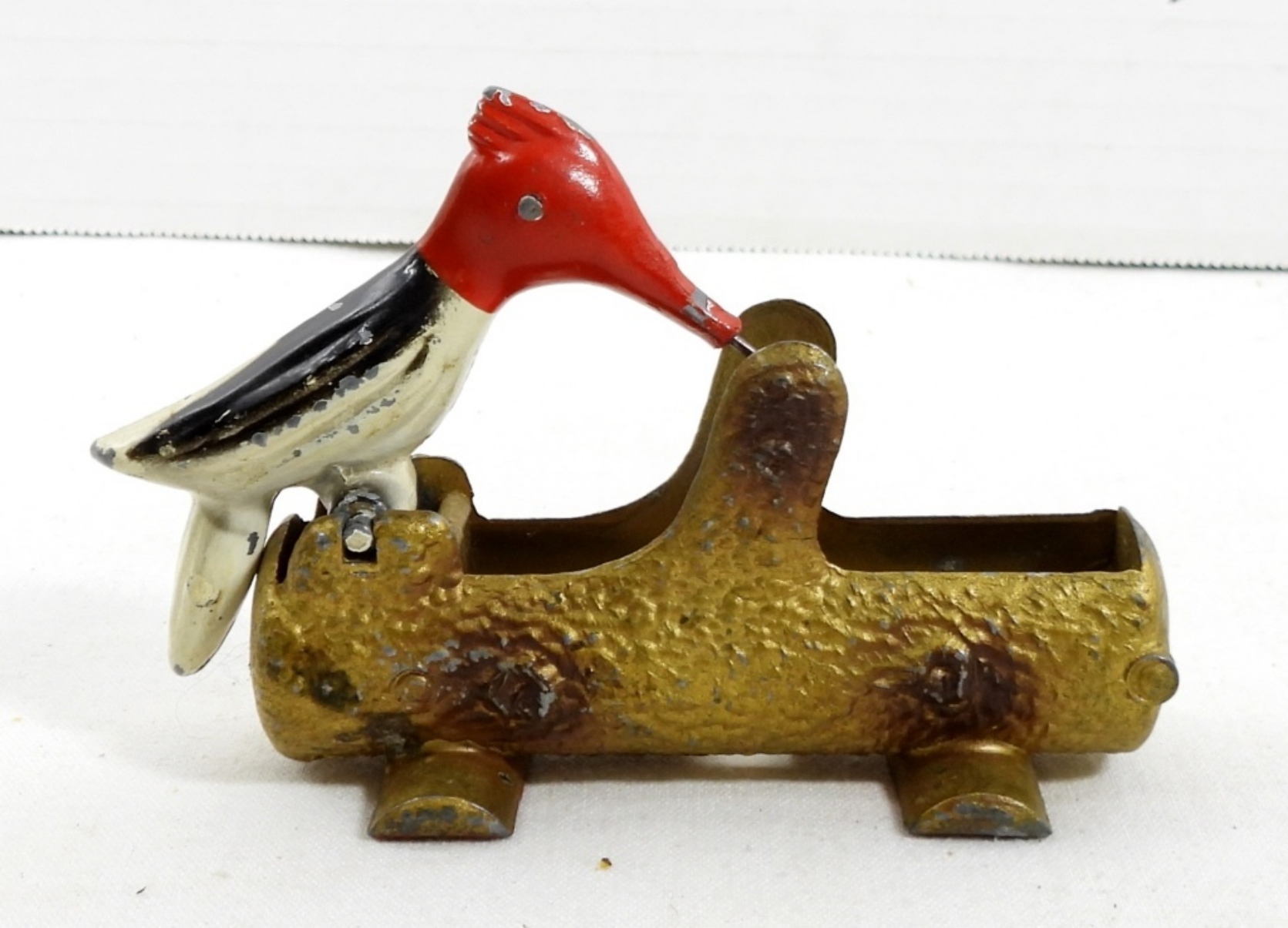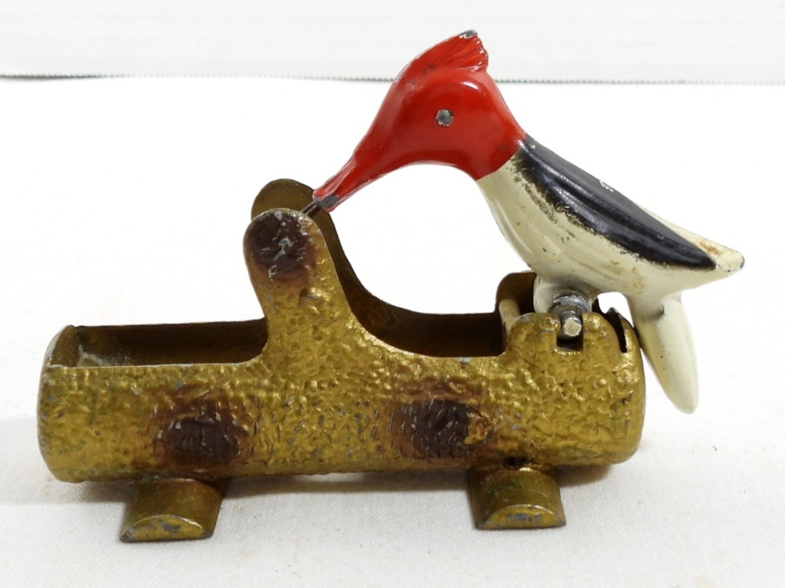 VINTAGE CAST IRON WOODPECKER ON LOG TOOTHPICK DISPENSER. (NICE COLORS)