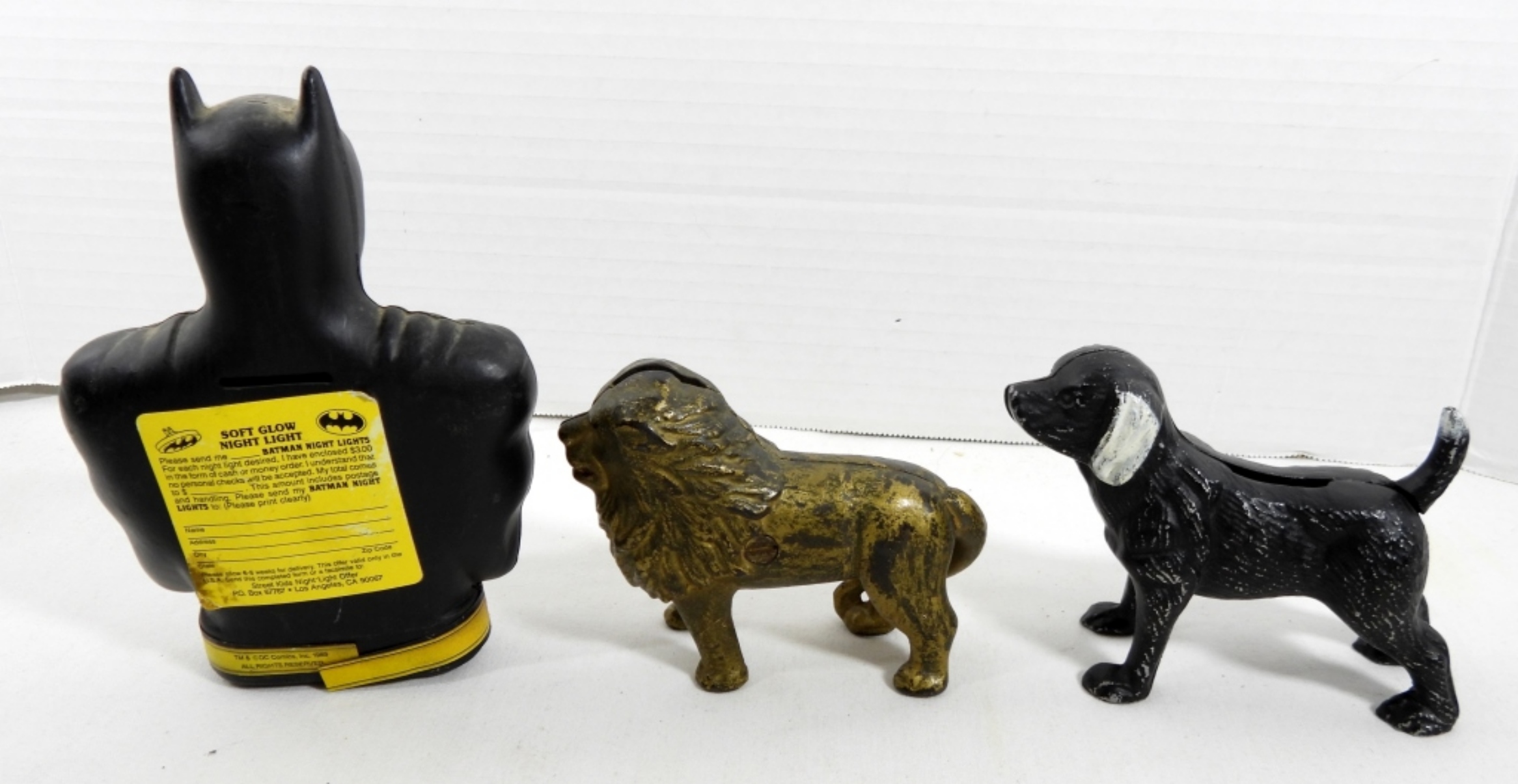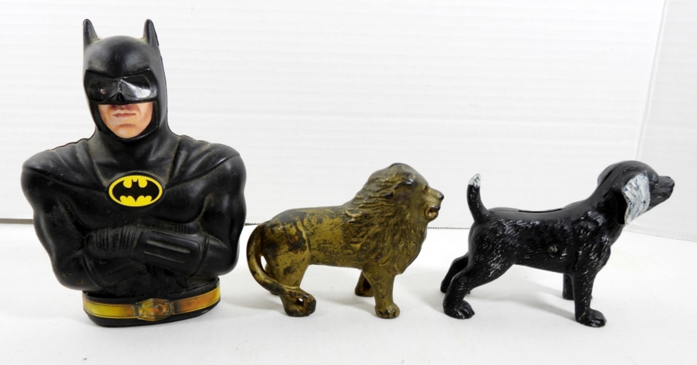 (3) VINTAGE COIN BANKS (2) CAST IRON , A BLACK DOS AND A GOLD LION AND 1 PLASTIC BATMAN BANK