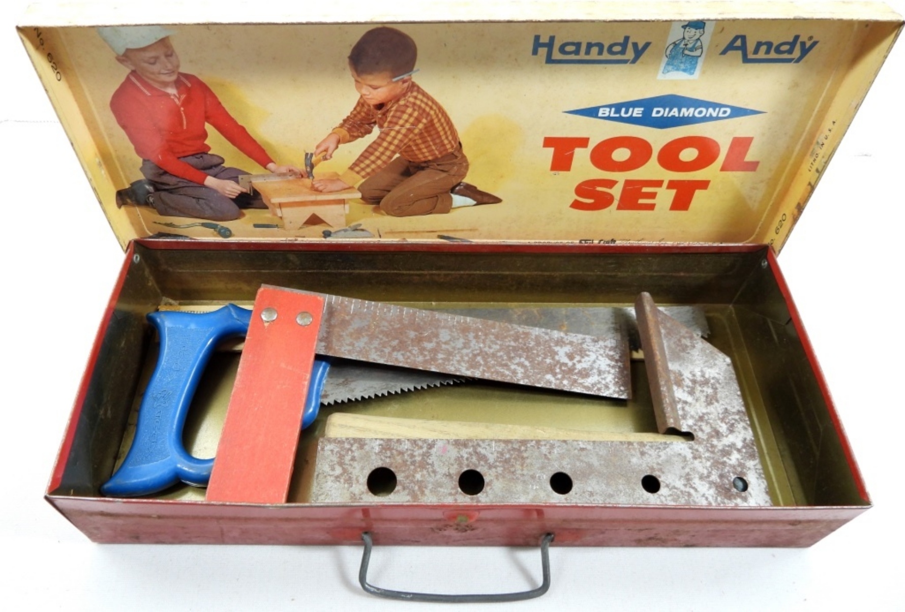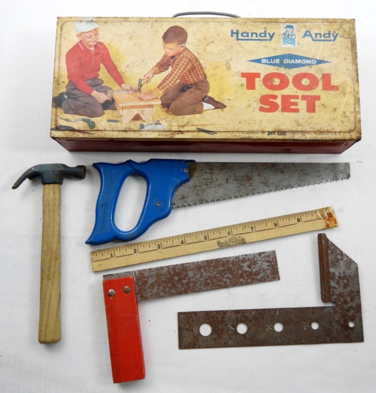 CONTAINS SAW, HAMMER with broken claw, (3) MEASURE TOOLS in TIN TOOL BOX
