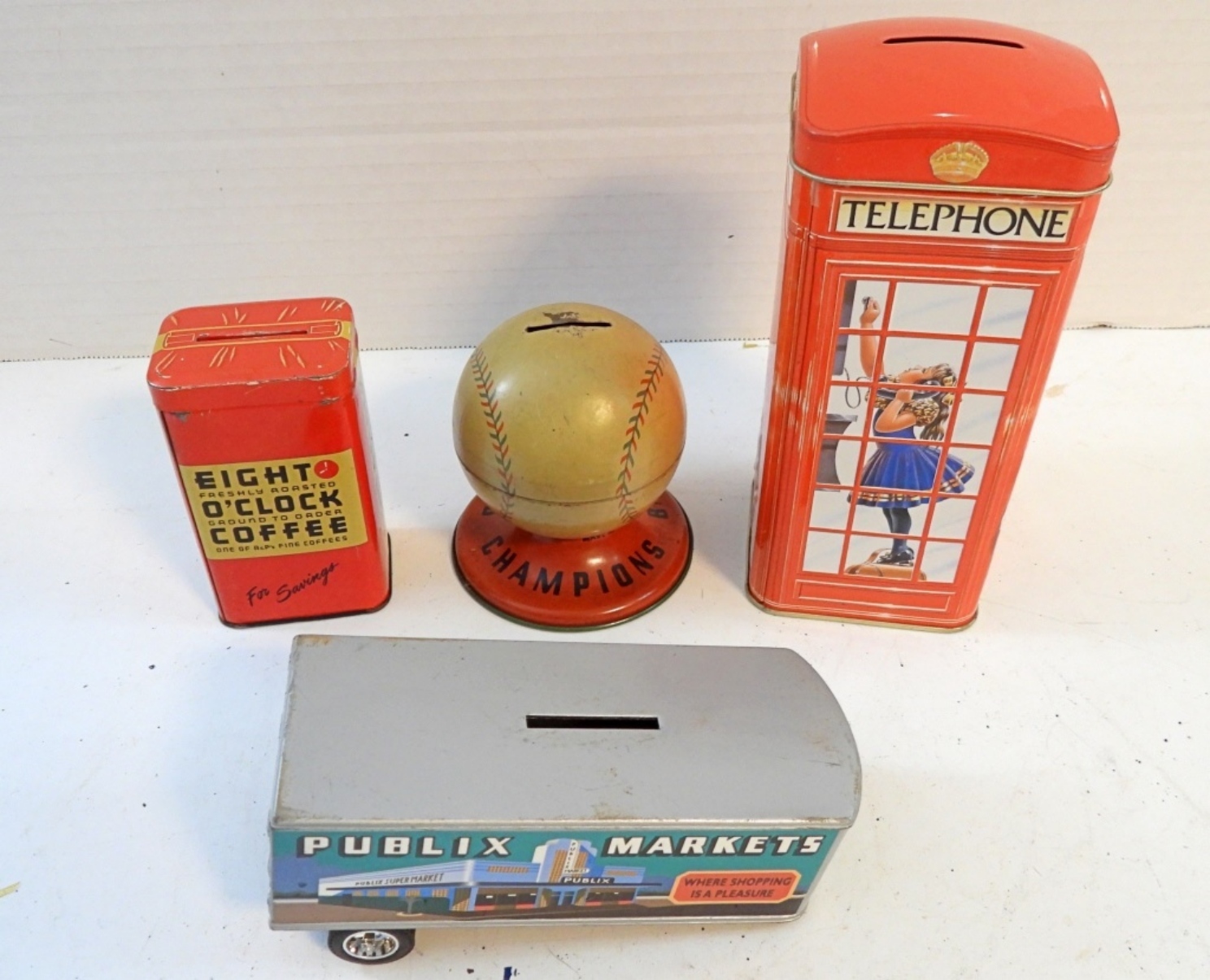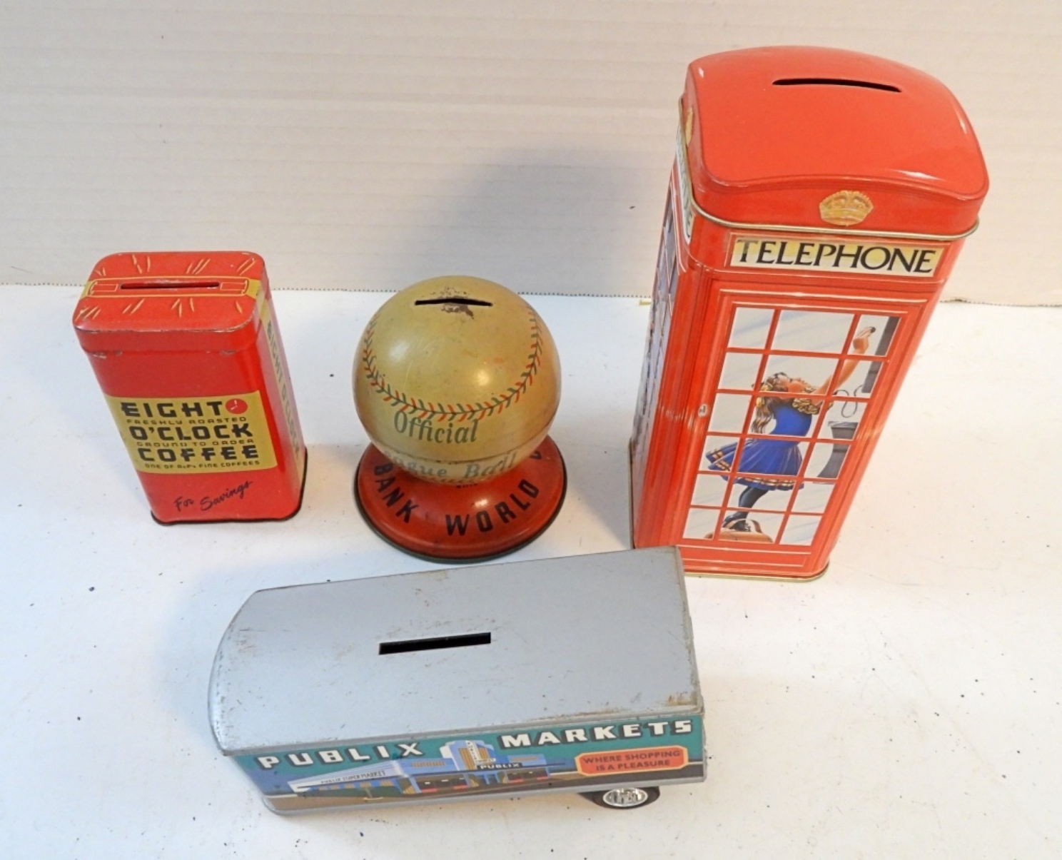 4 VINTAGE TIN COIN BANKS ASSORTED STYLES