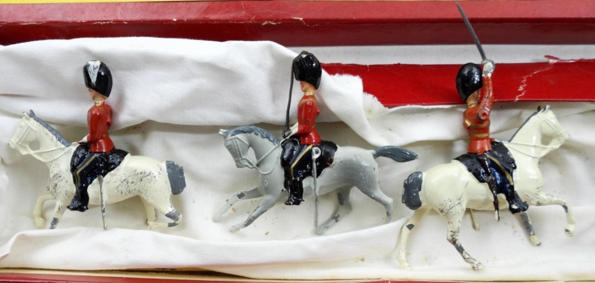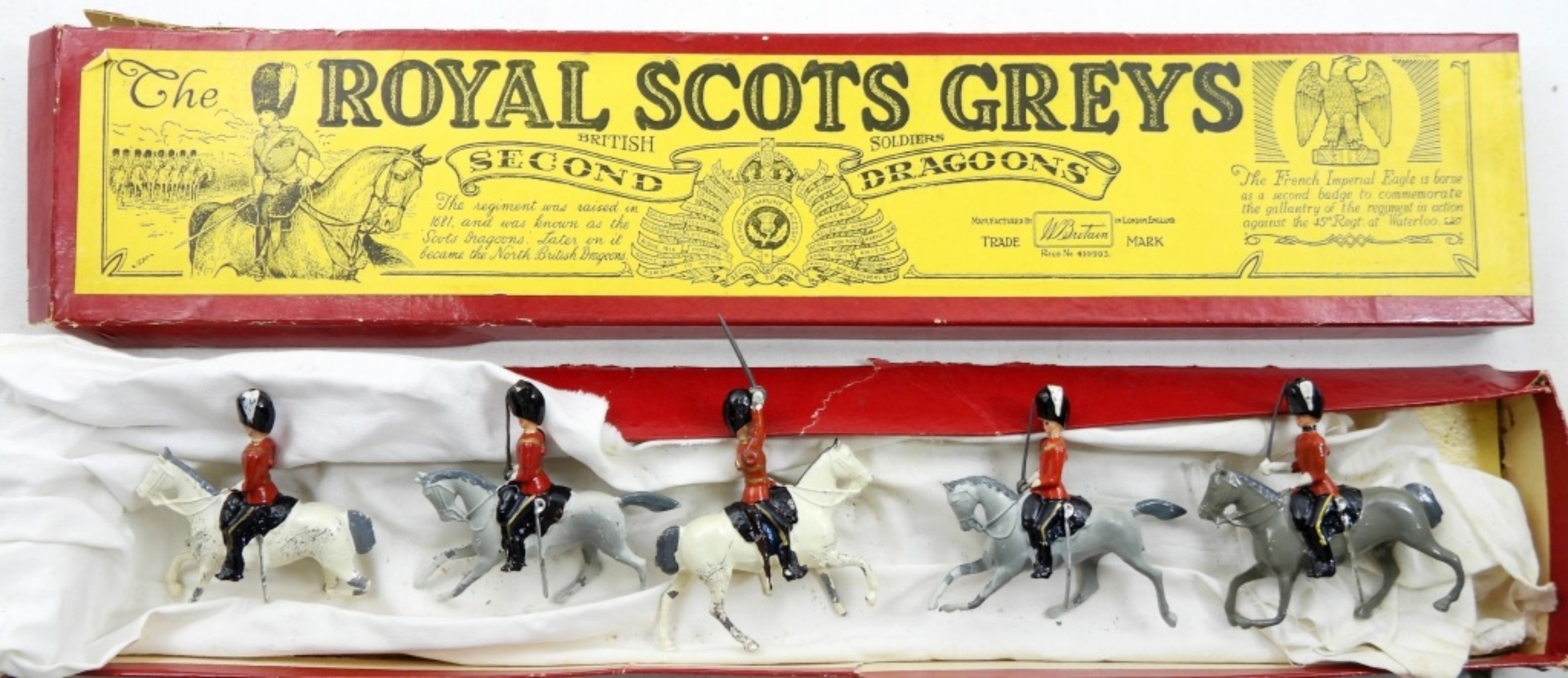 W.BRITAIN BOX SET OF 5 METAL ROYAL SCOTS GREY’S (2ND DRAGGONS) BRITISH SOLDIERS ON HORSEBACK, IN ORIGINAL BOX