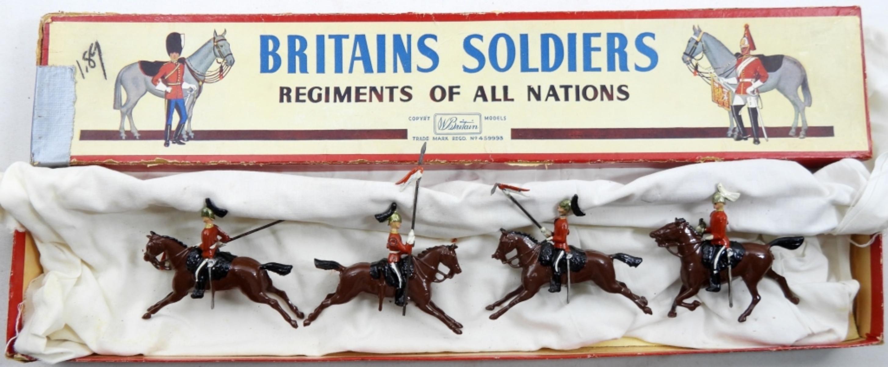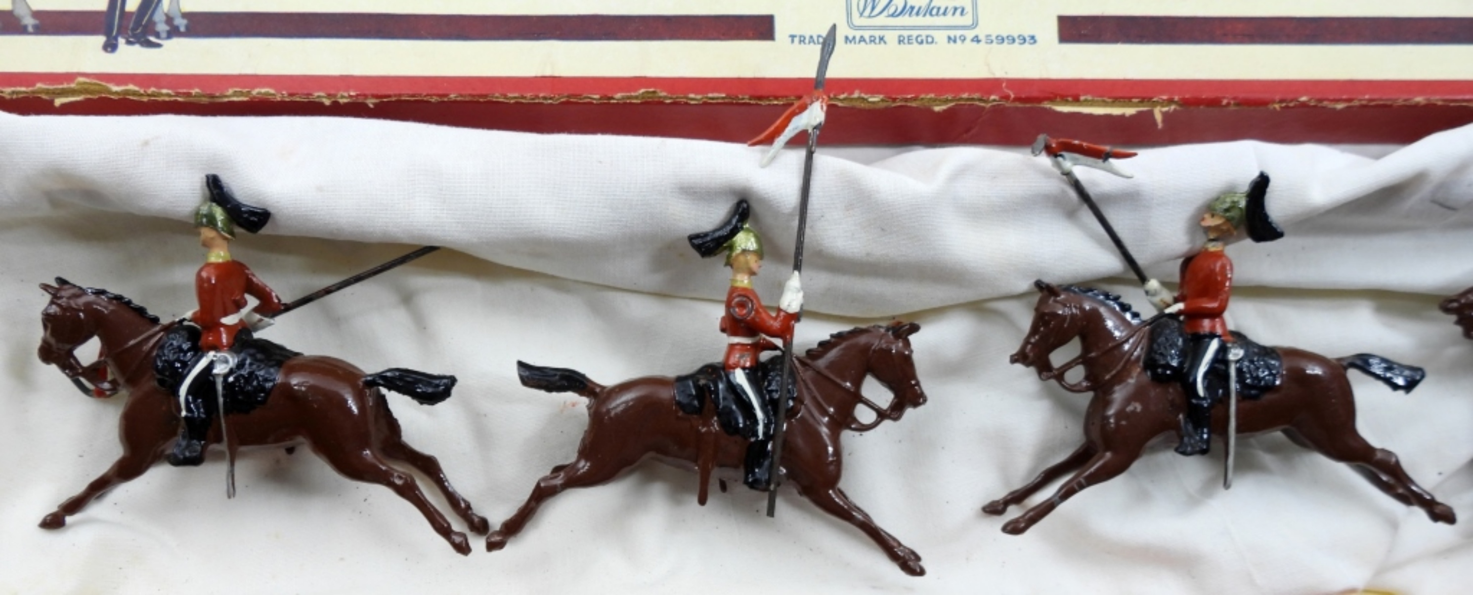 W.BRITAIN BOX SET OF 4 THE QUEENS BAYS (2ND DRAGOON’S GUARDS) METAL SOLDIERS ON BROWN HORSES. IN ORIGINAL BOX