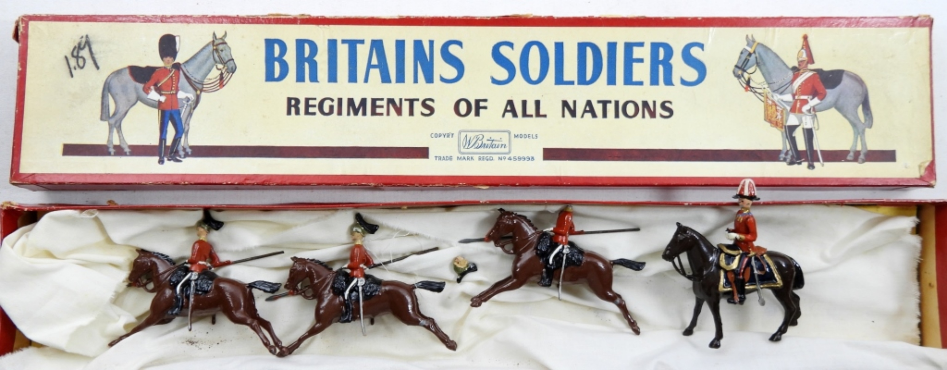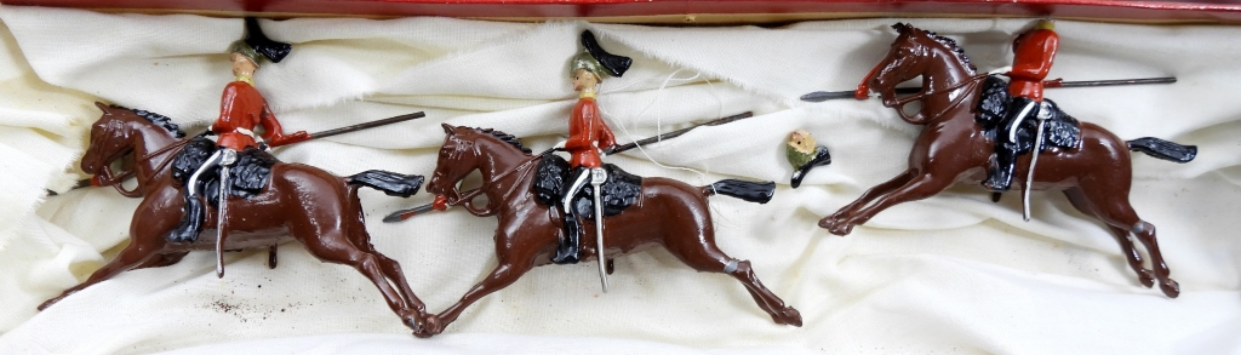 W.BRITAIN BOX SET OF 4 THE QUEENS BAYS (2ND DRAGOON’S GUARDS) METAL SOLDIERS ON BROWN HORSES. IN ORIGINAL BOX (1 SOLDIER IS BROKEN)