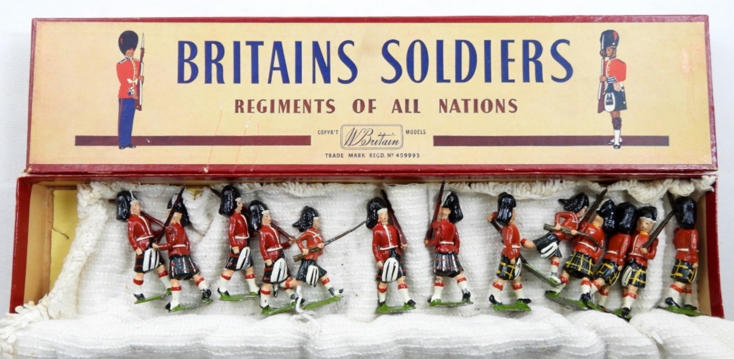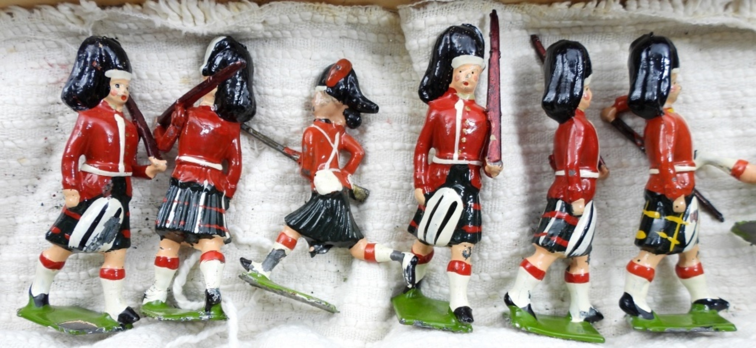 W.BRITAIN BOX SET OF 13 HIGHLAND SOLDIERS , METAL SOLDIERS WEARING KILTS ,IN BOX