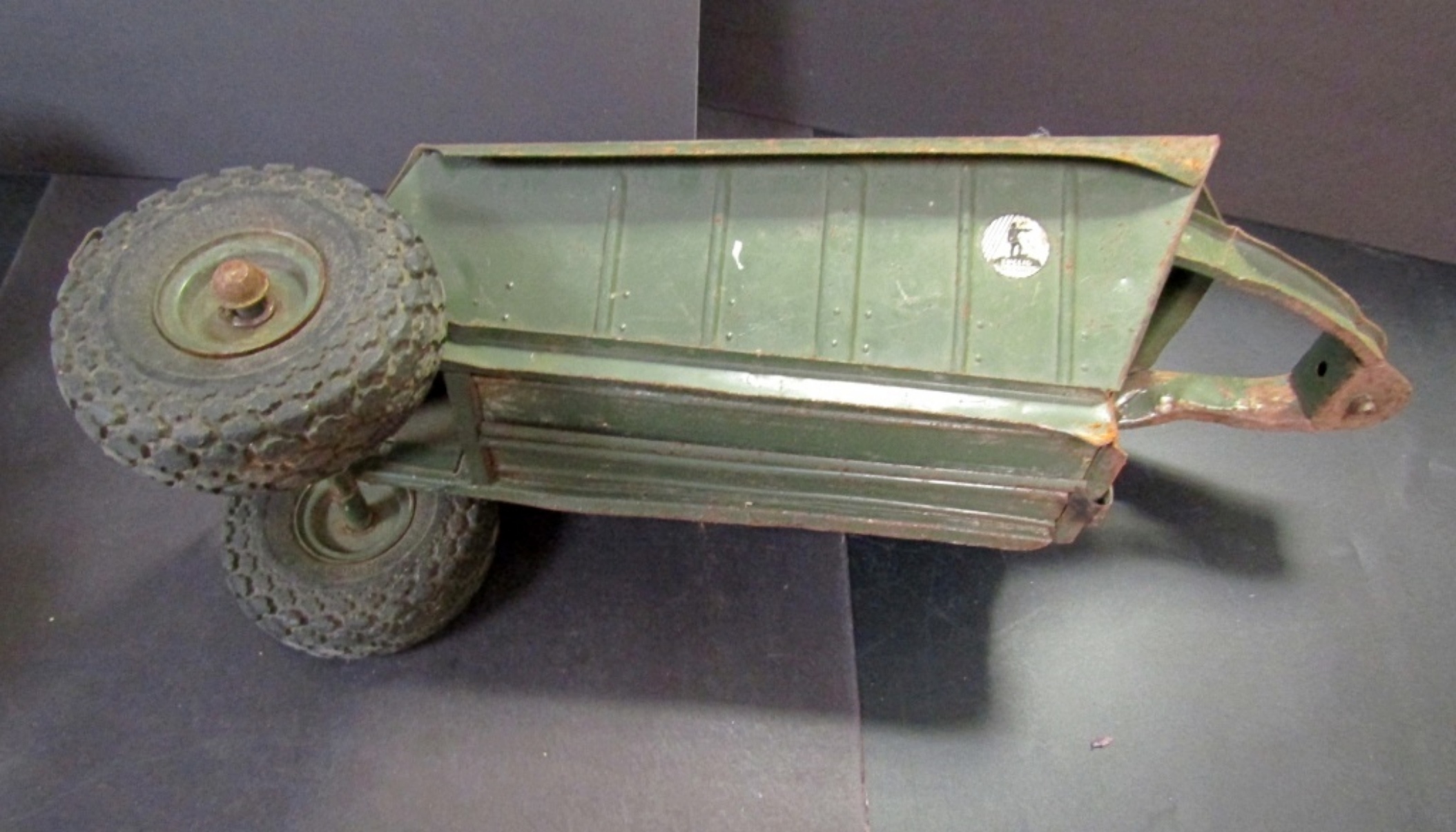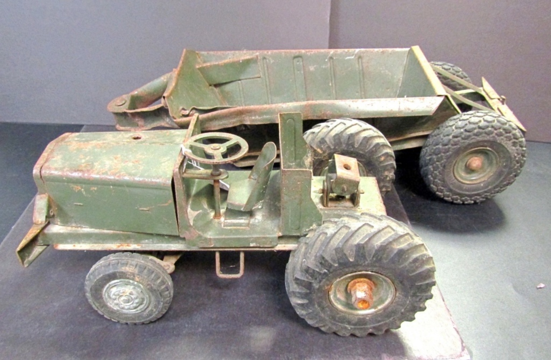 DOEPKE EUCLID 1950s THE PIONEER METAL TOY (2 PIECES). TRUCK MEASURES 12″L x 7″W. TRAILER MEASURES 19″L x 8″W. RUSTY, DENTED, STILL ROLLS WELL.