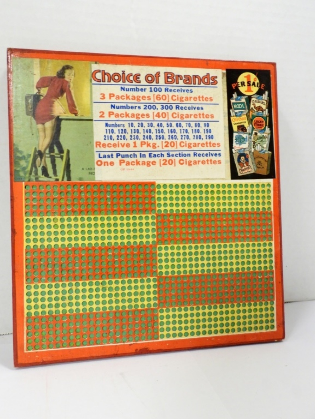 VINTAGE 1c CHOICE OF BRANDS CIGARETTE PUNCHBOARD( (A LAD-HER PROBLEM PIN UP IN CORNER) 8.5″X 9″ , UNUSED WITH A SEALED PINCH KEY