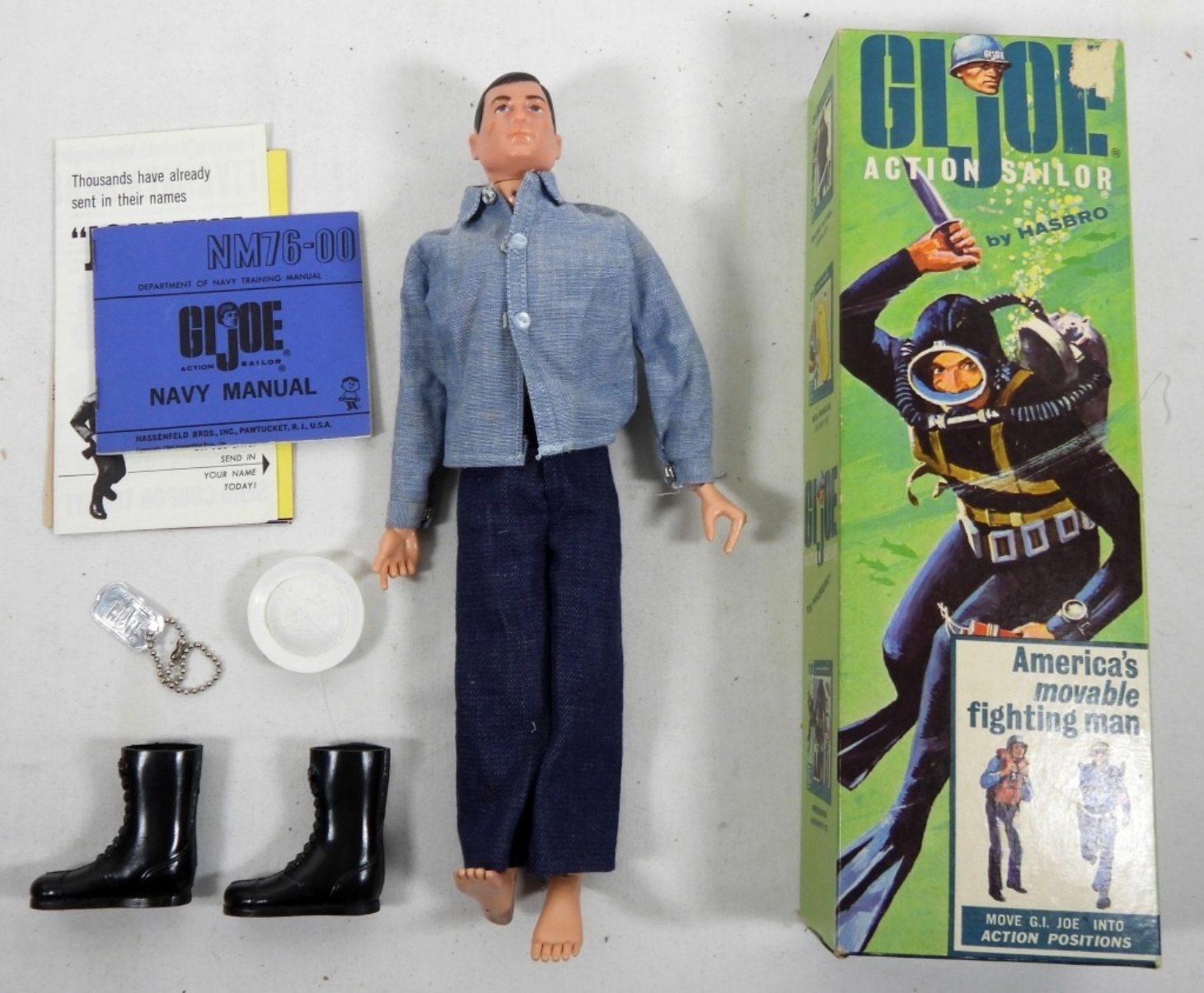 VINTAGE 1964 GI JOE ACTION SAILOR IN ORIGINAL BOX WITH UNIFORM, HAT ,BOOTS, DOG TAGS AND NAVY MANUAL