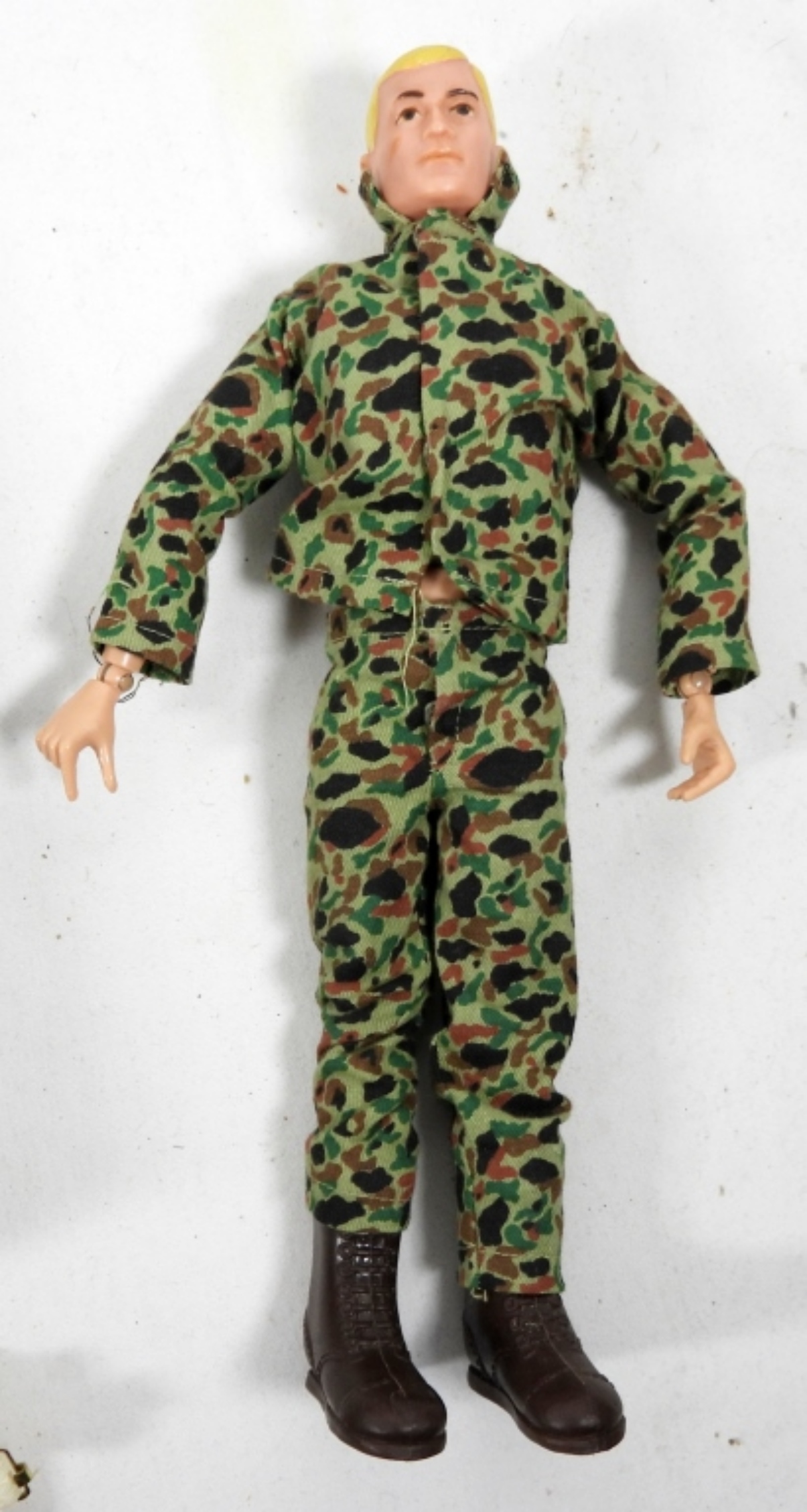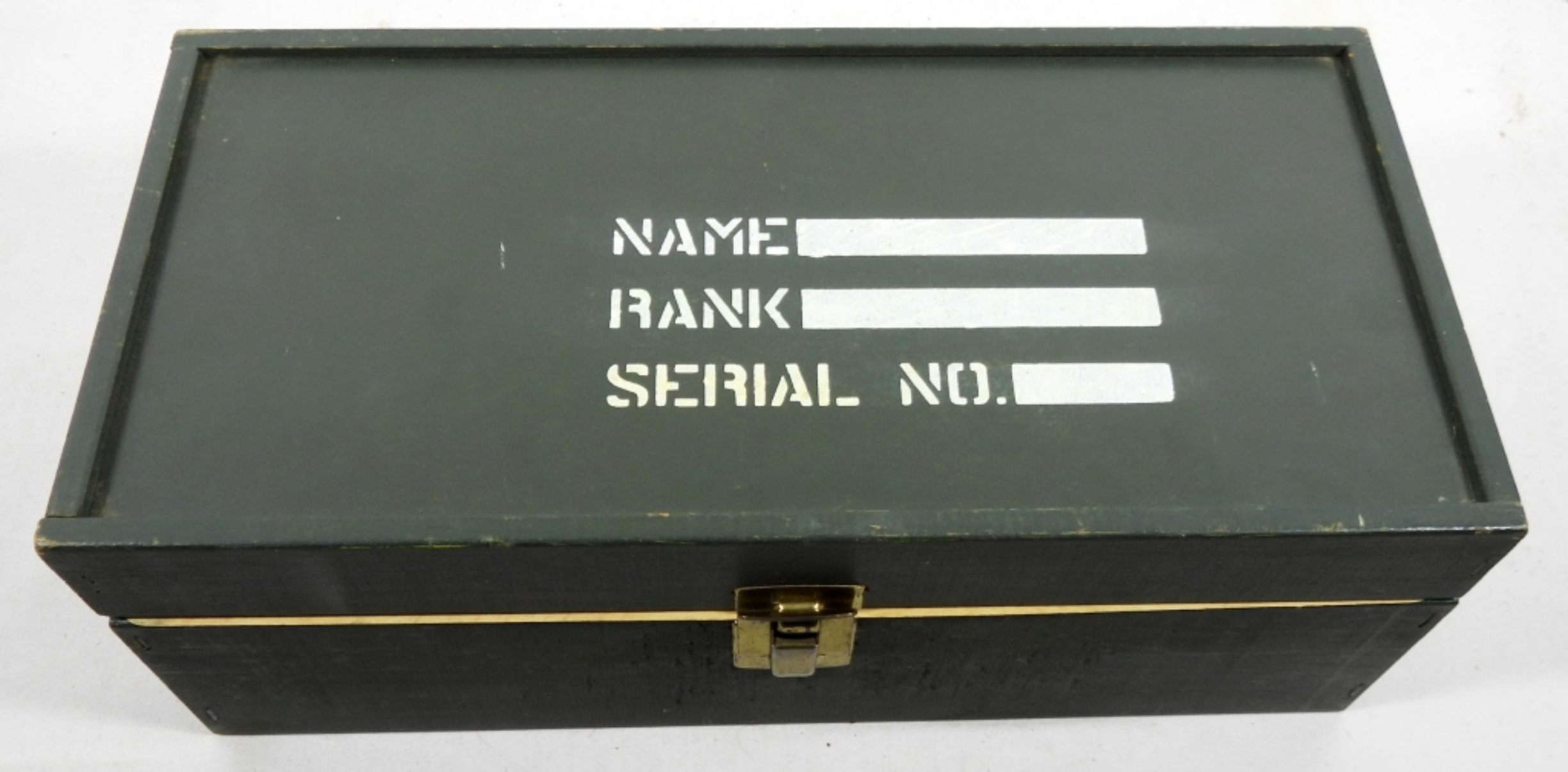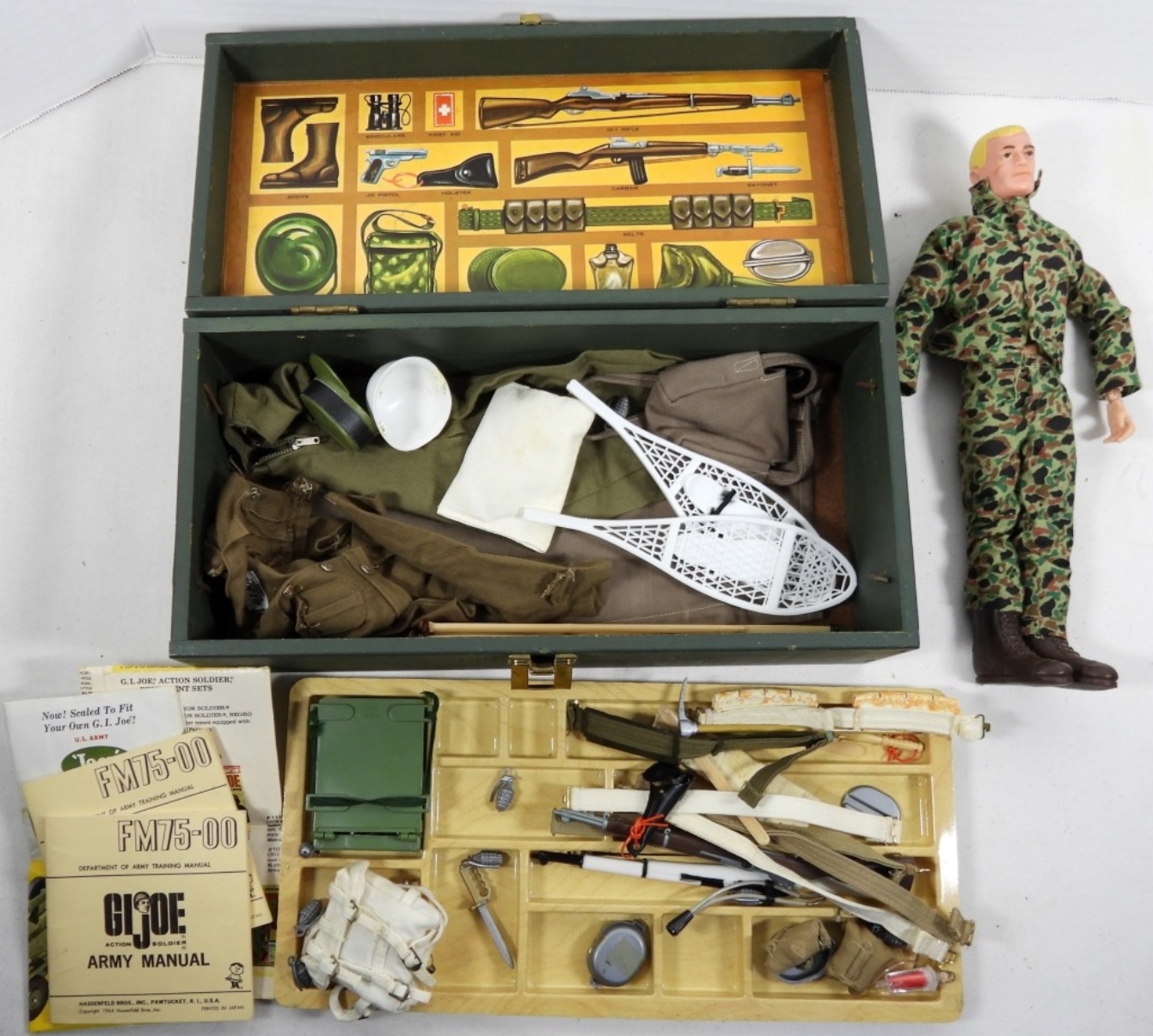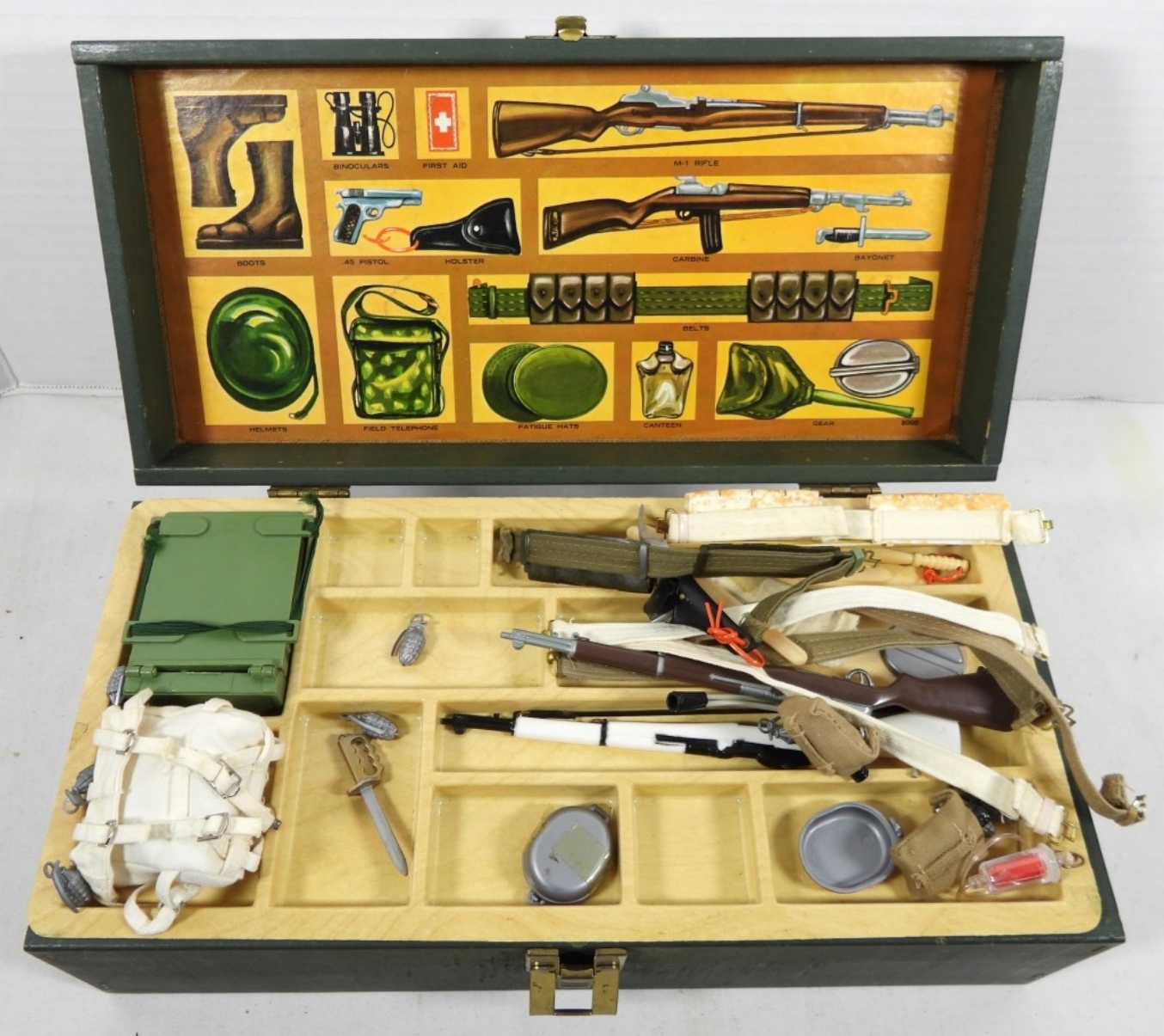 VINTAGE 1964 GI JOE FIGURE 12″ WITH BLOND HAIR AND SCAR ON RIGHT CHEEK( ALL FINGERS AND TOES INTACT), GREEN WOODEN FOOT LOCKER WITH TRAY & MANY ACCESSORIES
