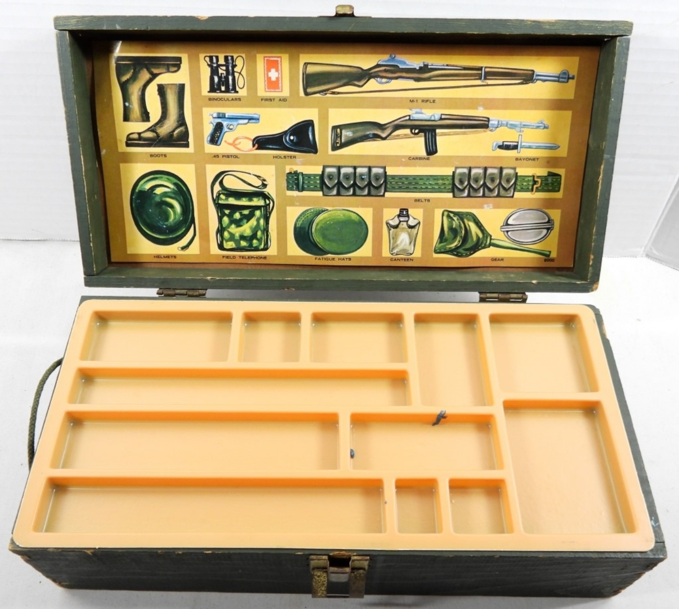VINTAGE GREEN WOODEN GI JOE FOOT LOCKER WITH TRAY