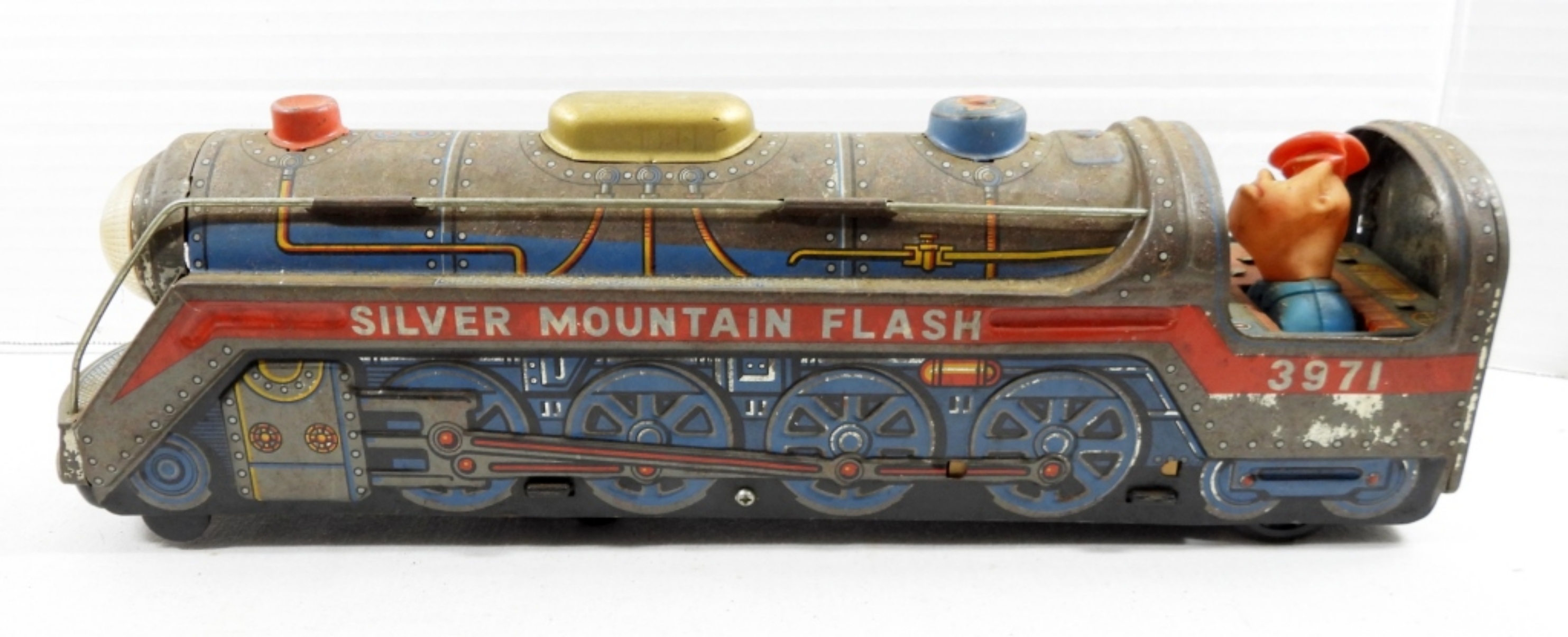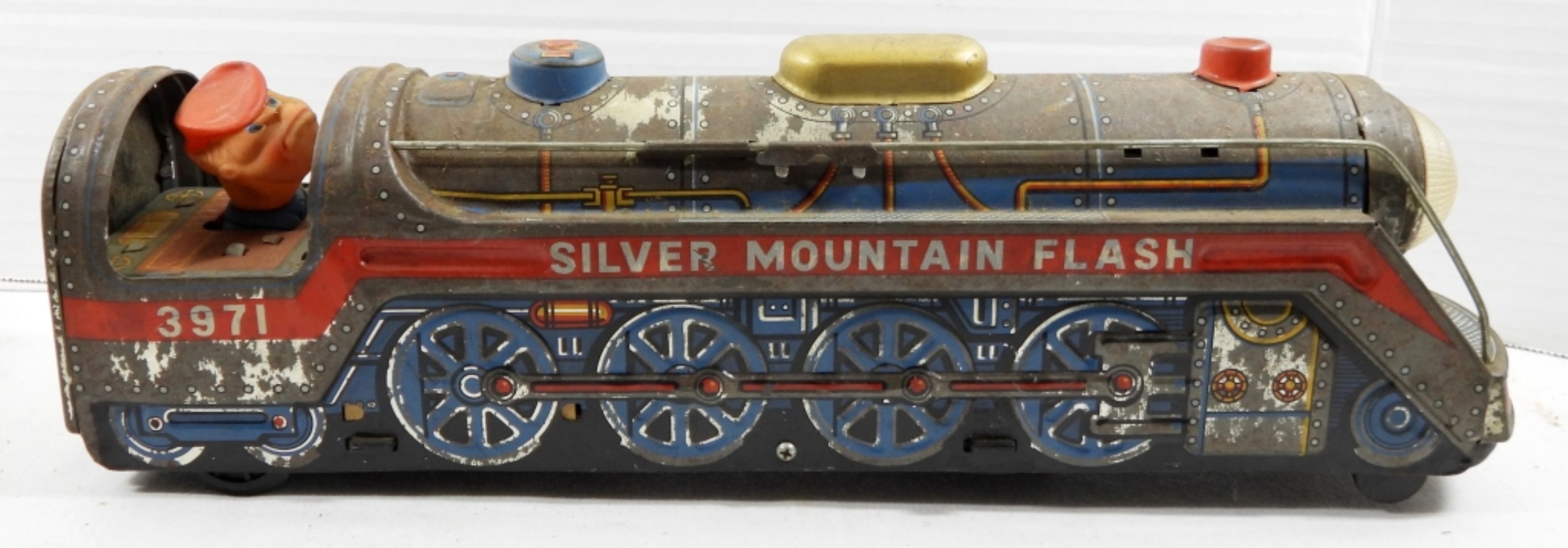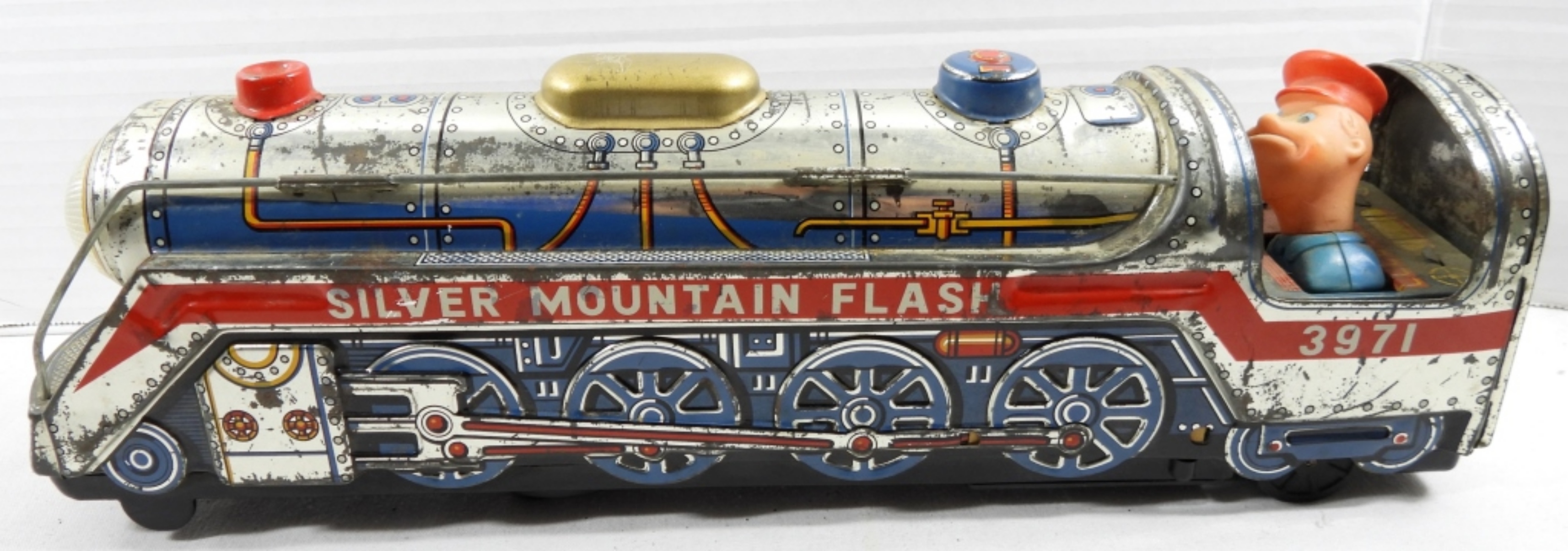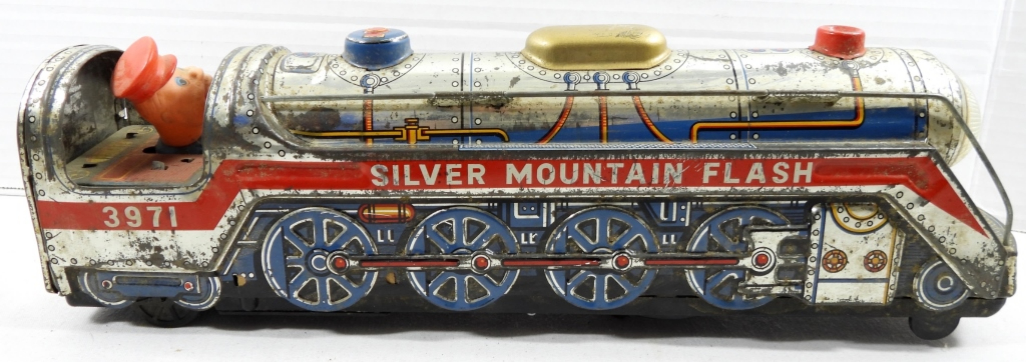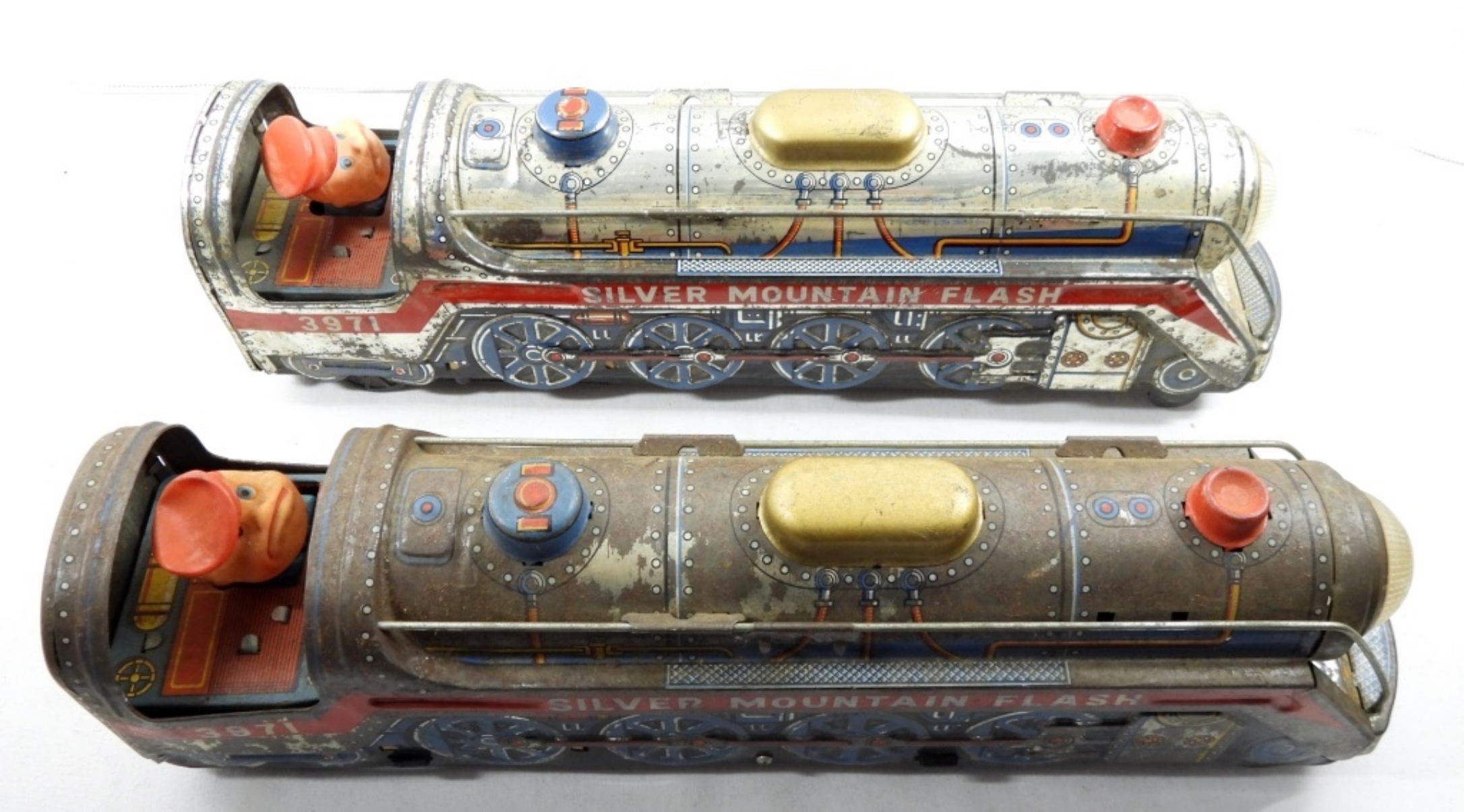 (2) 1960’S TIN SILVER MOUNTAIN FLASH TRAIN, 3971. MADE BY MODERN TOYS JAPAN ( SOME RUST )
