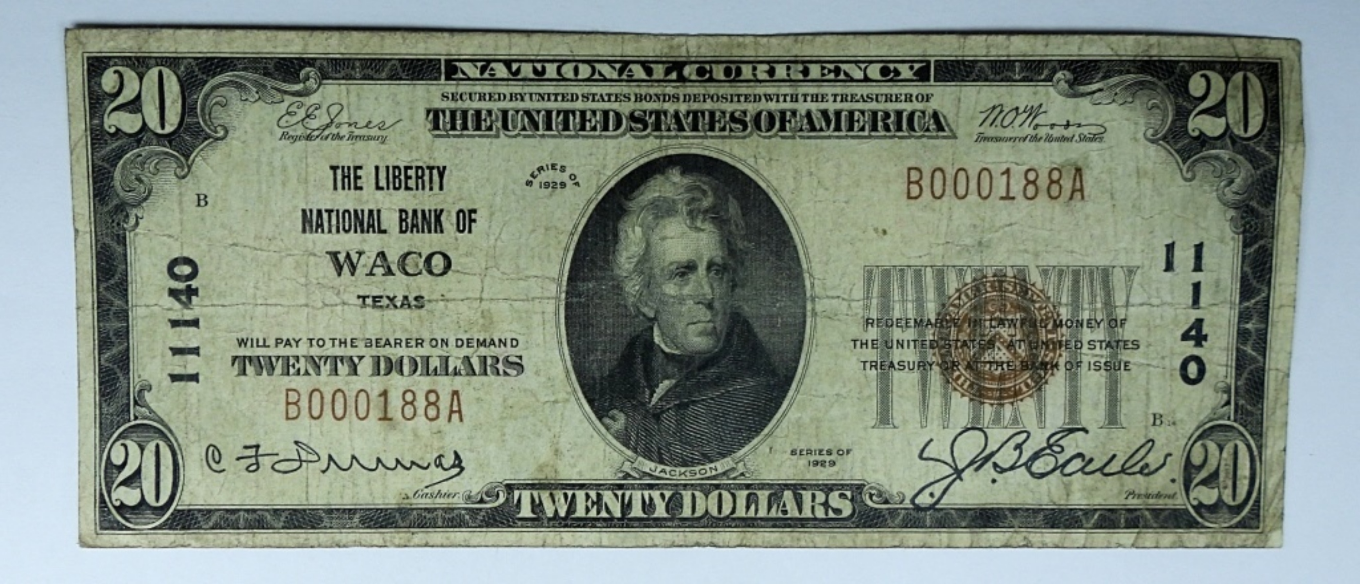 1929 $20 NATIONAL CURRENCY, WACO TEXAS