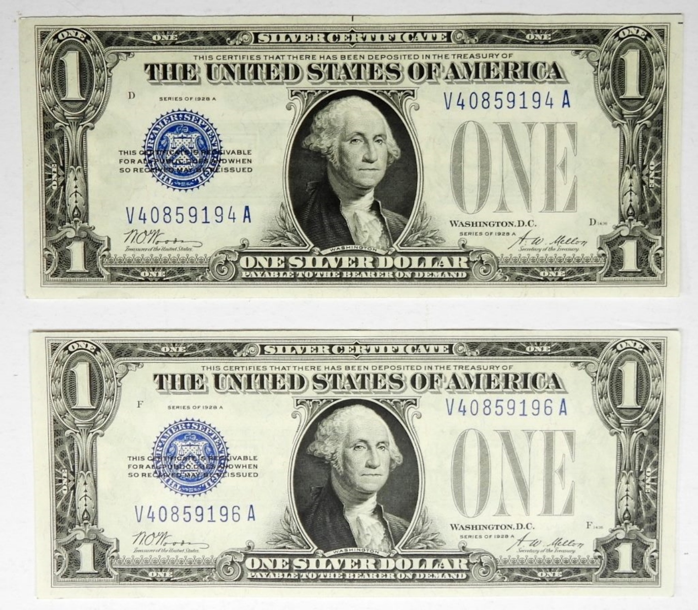 (2) 1928 A $1 SILVER CERTS (FUNNY BACK) AU+