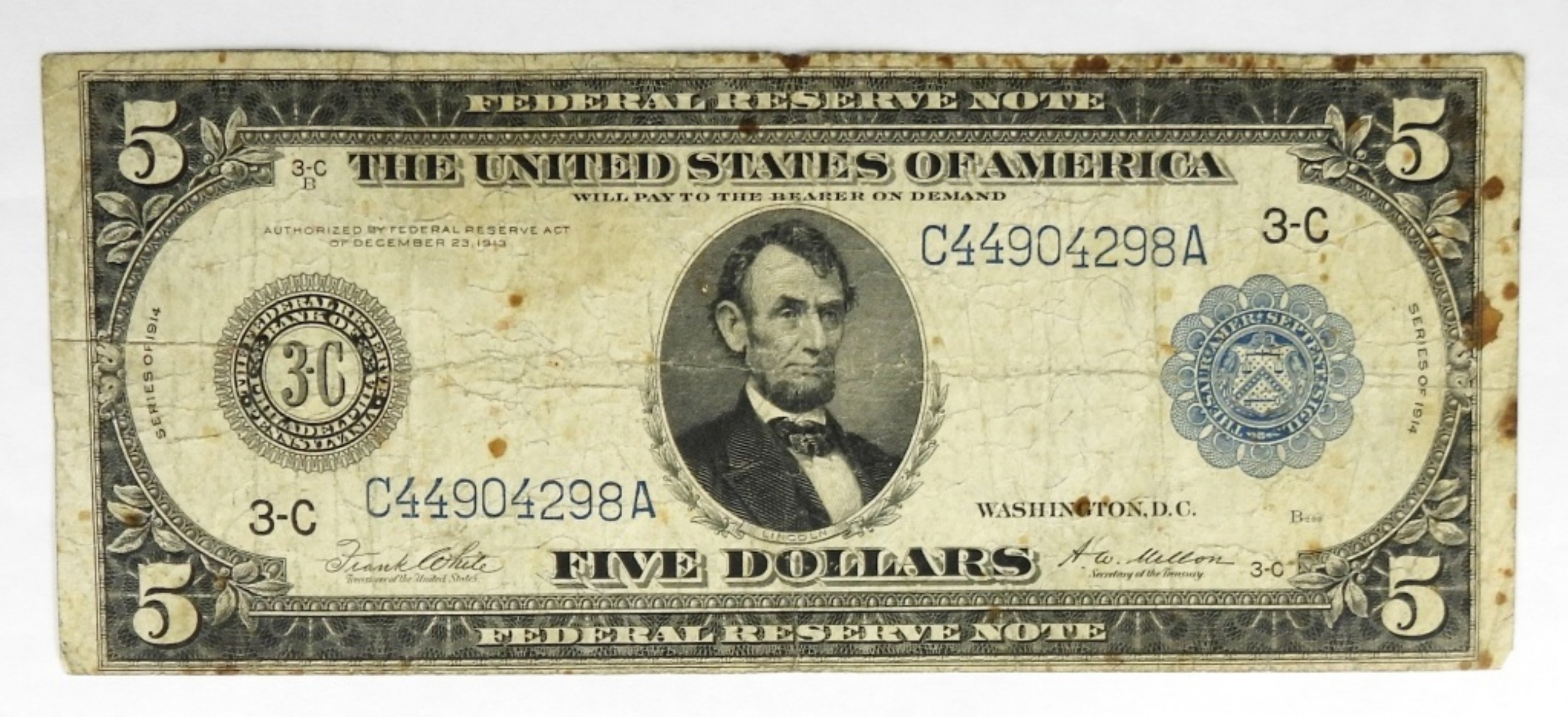 1914 $5 FED RESERVE NOTE (PHILADELPHIA )