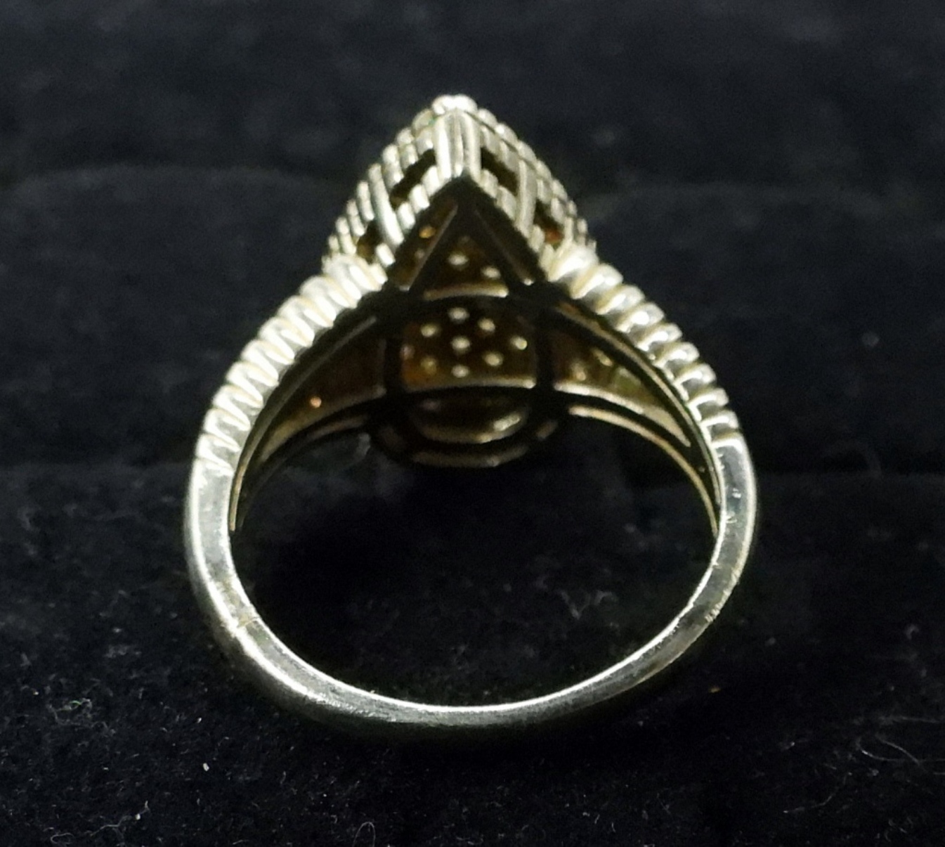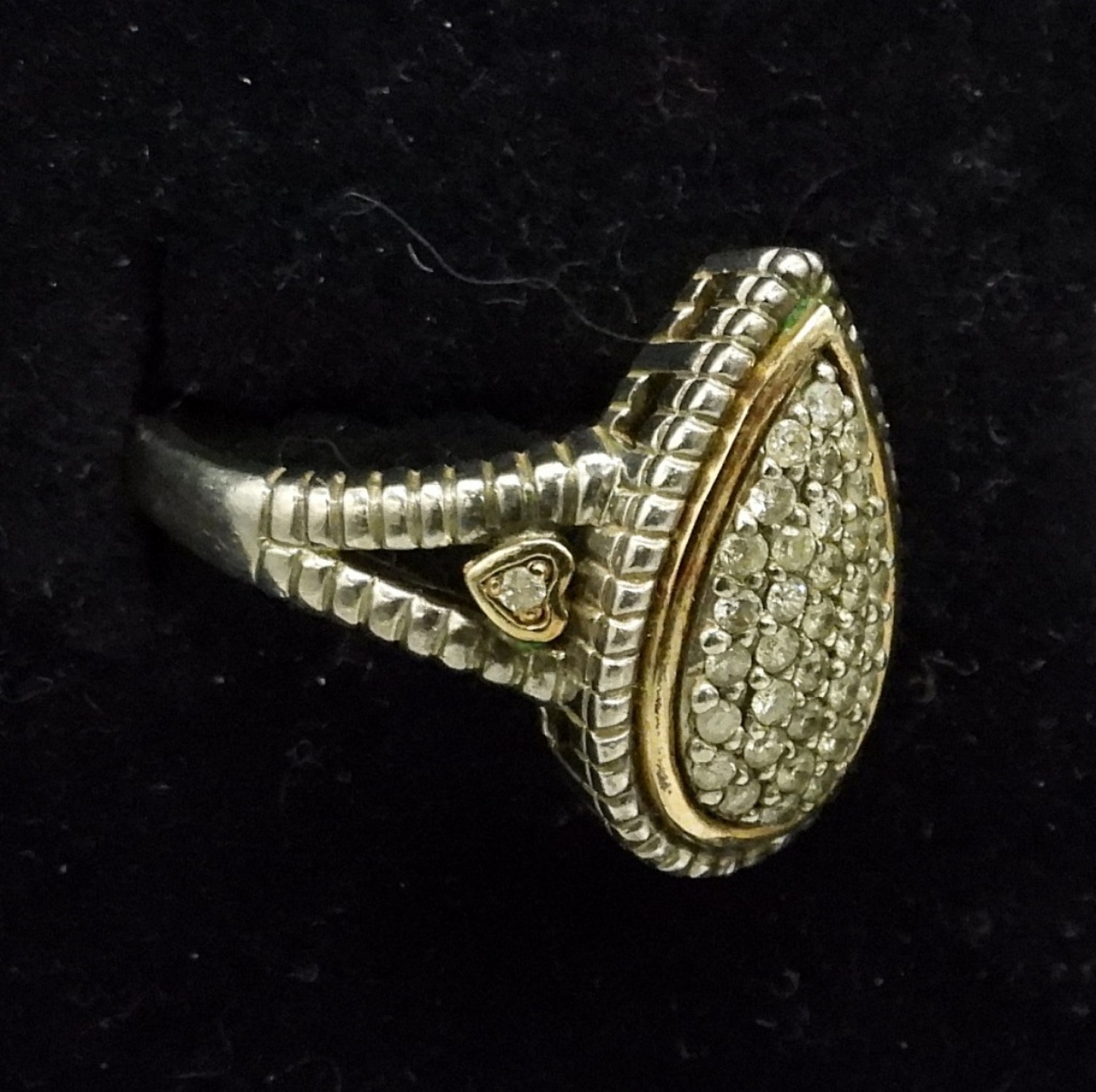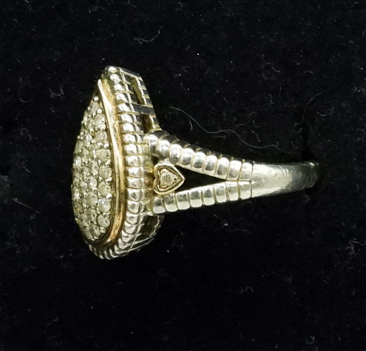 PEAR SHAPED STERLING AND 14K YELLOW GOLD RING WITH MOSTLY MOISSANITE GEMSTONES AND A FEW GENUINE DIAMONDS. VERY PRETTY RING WITH A LITTLE TARNISH. SIZE 7. 3.3 DWT
