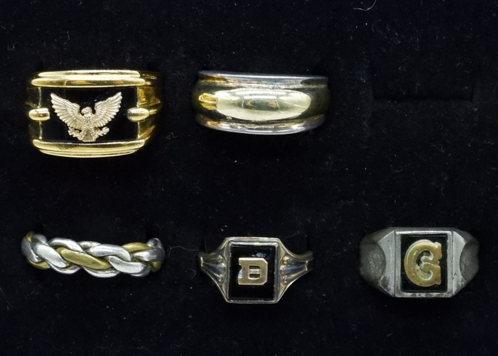 FIVE STERLING SILVER MEN’S RINGS. SIZES 8-10. 30 DWT