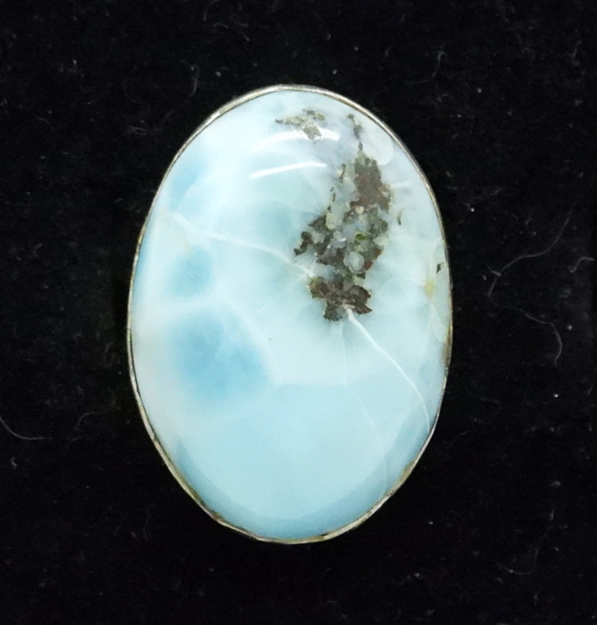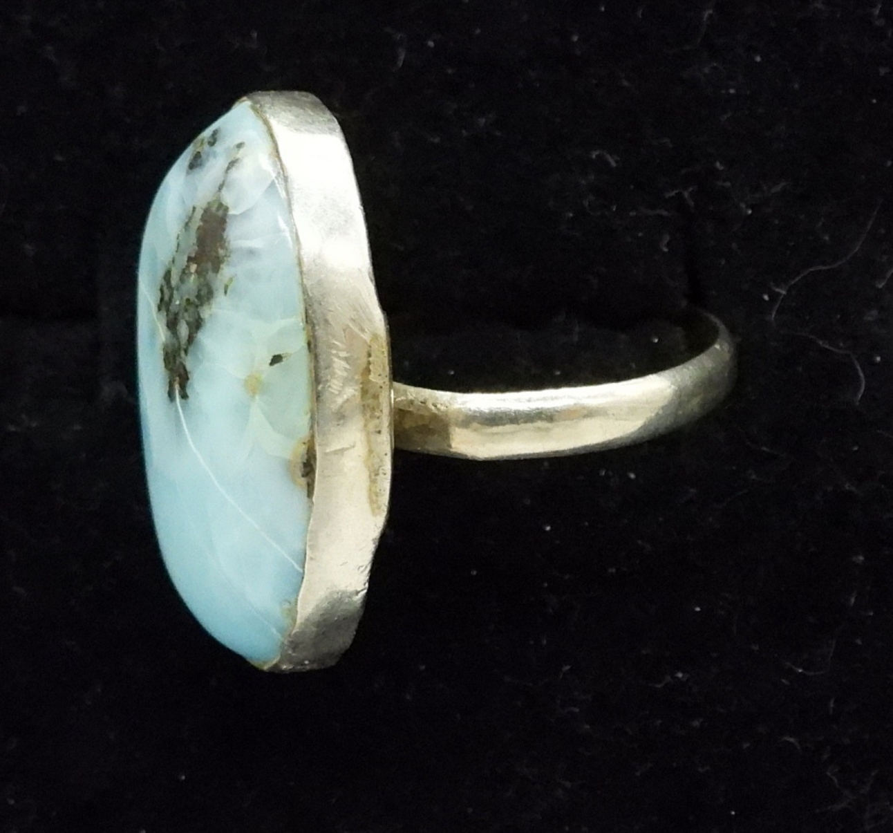 LARGE LARIMAR GEMSTONE SET IN STERLING SILVER, SIZE 7. LARIMAR MEASURES 1″ LONG. 5.6 DWT
