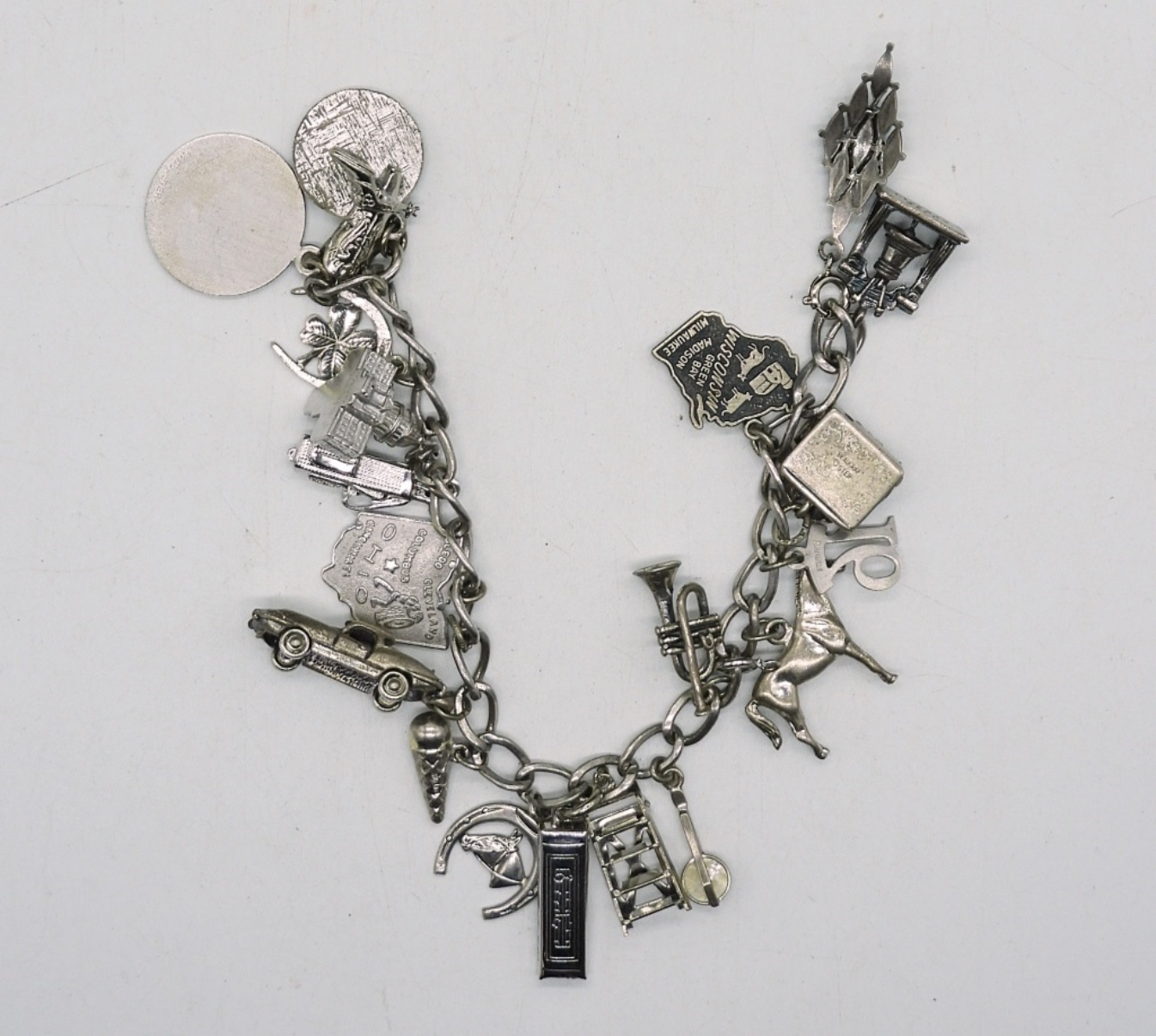VINTAGE STERLING CHARM BRACELET WITH 20 CHARMS. NEEDS NEW CLASP! 7″. 34 DWT