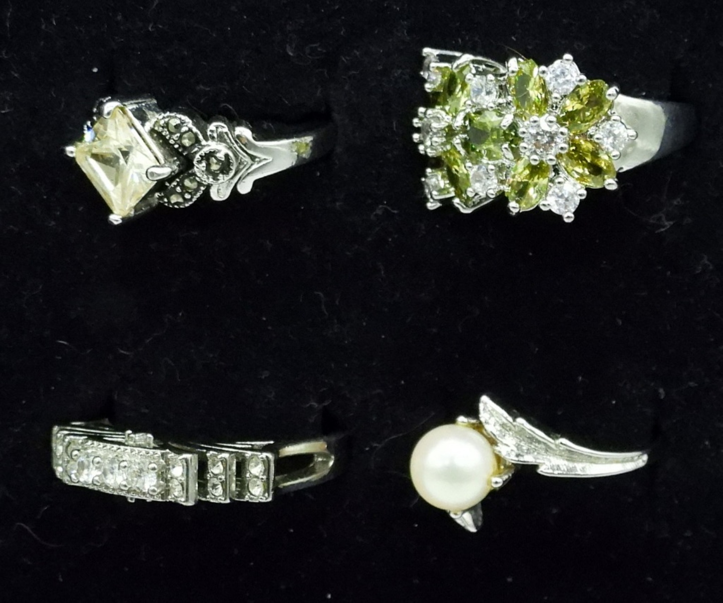 FOUR STERLING SILVER BRIDAL STYLE RINGS, VERY PRETTY. SIZES 7 & 9. 10.7 DWT