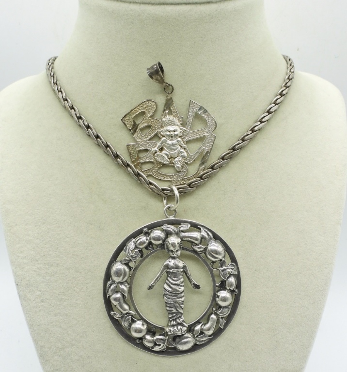 SWADDLED INFANT PENDANT (2″x2″) ON A THICK 20″ STERLING CHAIN. STERLING “BAD BOY” PENDANT. 37.6 DWT