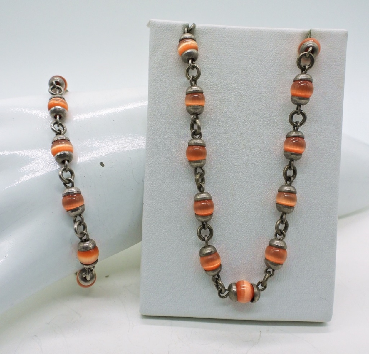 Vintage Sterling “Mexico 925″ marked, Orange Cats Eye Necklace (17″) and Bracelet (8”). 10 DWT