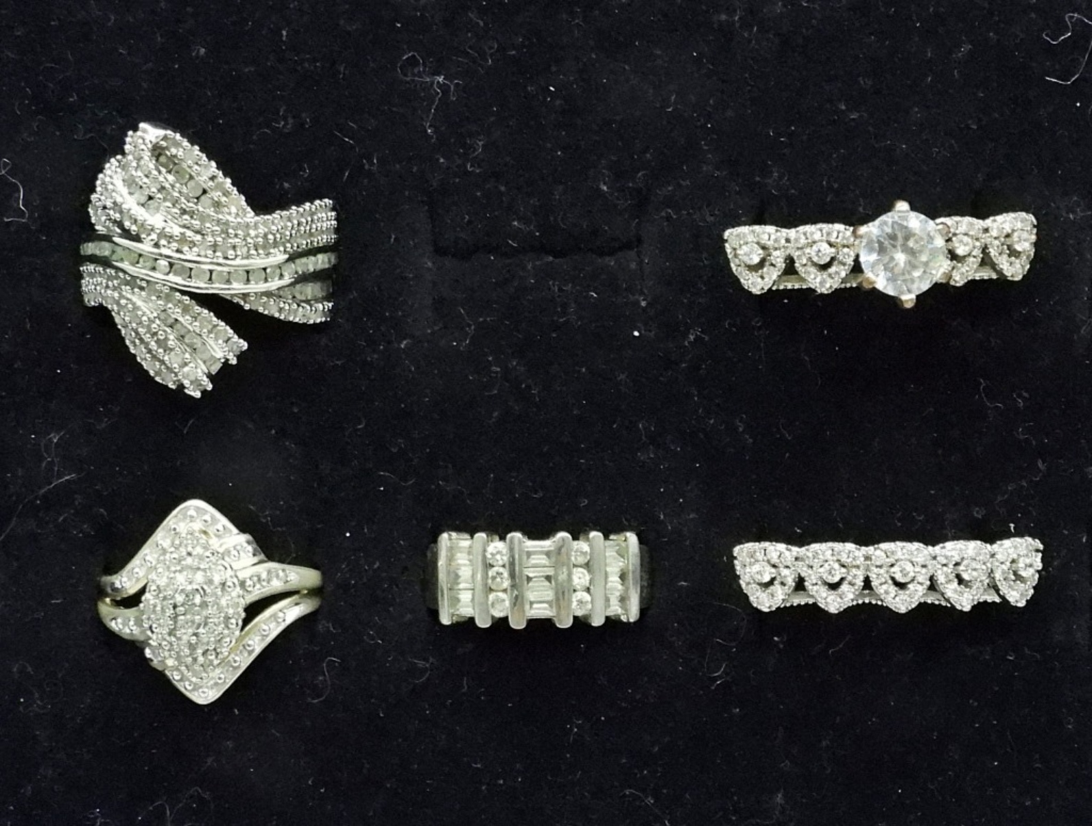 FIVE STERLING SILVER BRIDAL STYLE RINGS. SIZES 6, 7, 10. 16 DWT