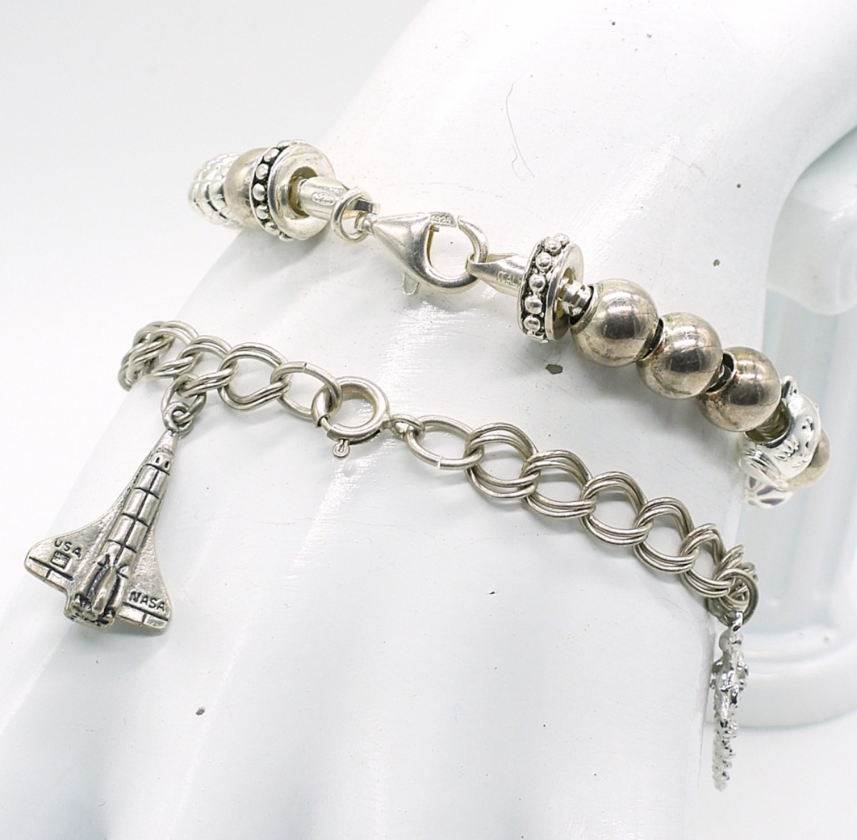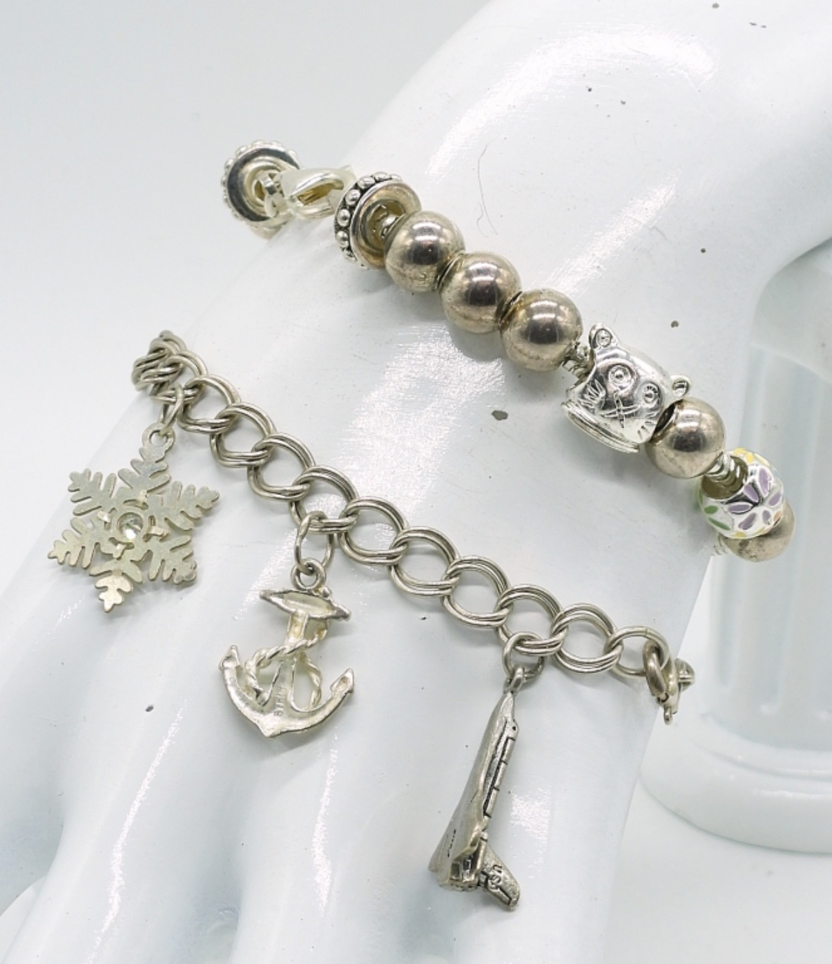 TWO MODERN STERLING SILVER CHARM BRACELETS. 7 & 7.5″. 21 DWT