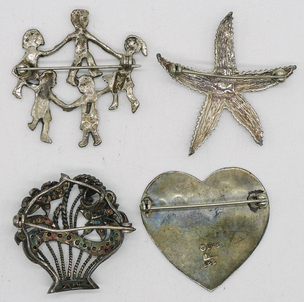FOUR STERLING SILVER BROOCHES. 1.5″ – 2″. 23.6 DWT