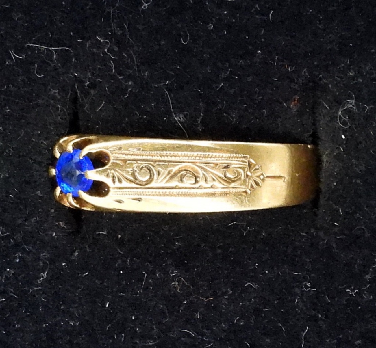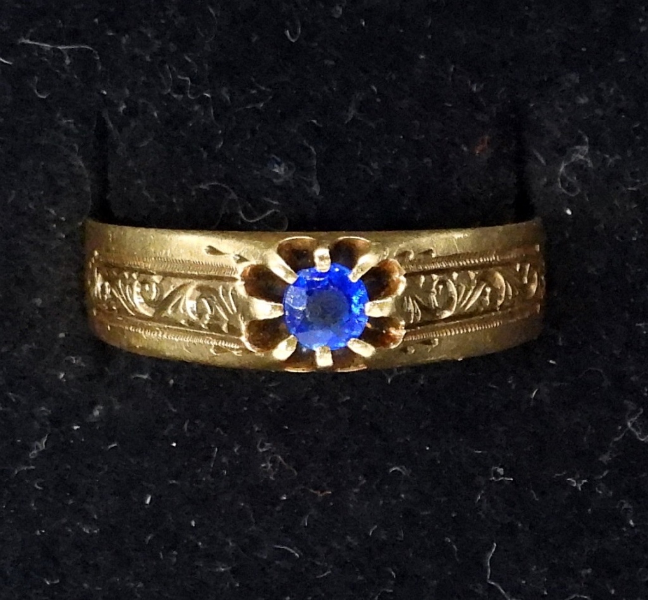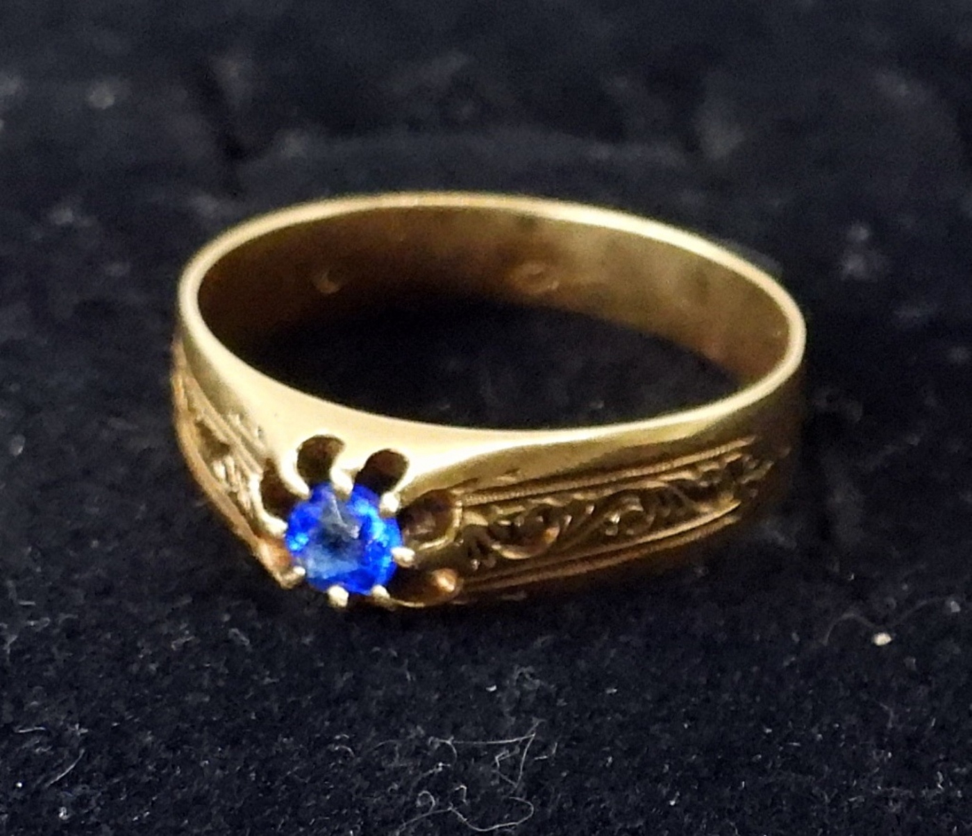 GORGEOUS 14K YELLOW GOLD ETCHED BAND RING WITH BLUE GEMSTONE (GEMSTONE MAY OR MAY NOT BE GENUINE). SIZE 8.5-9. 1.9 DWT Not marked 14K, It was tested and tested as 14k!