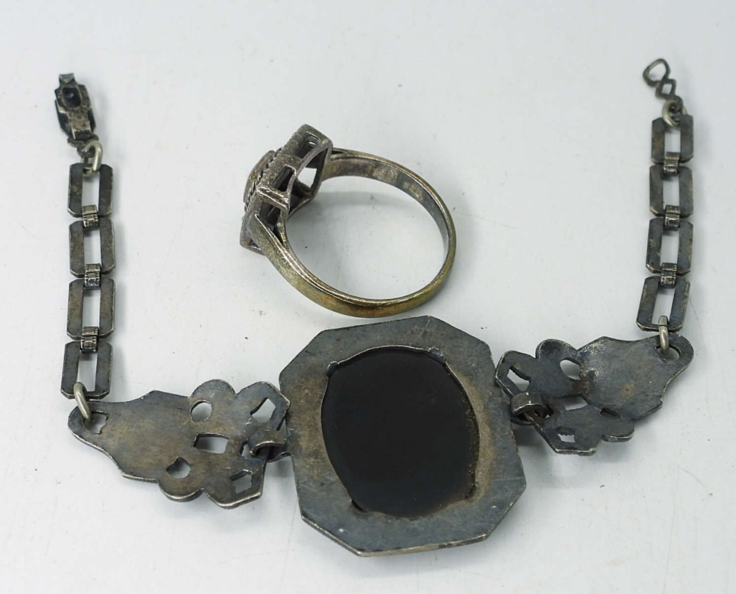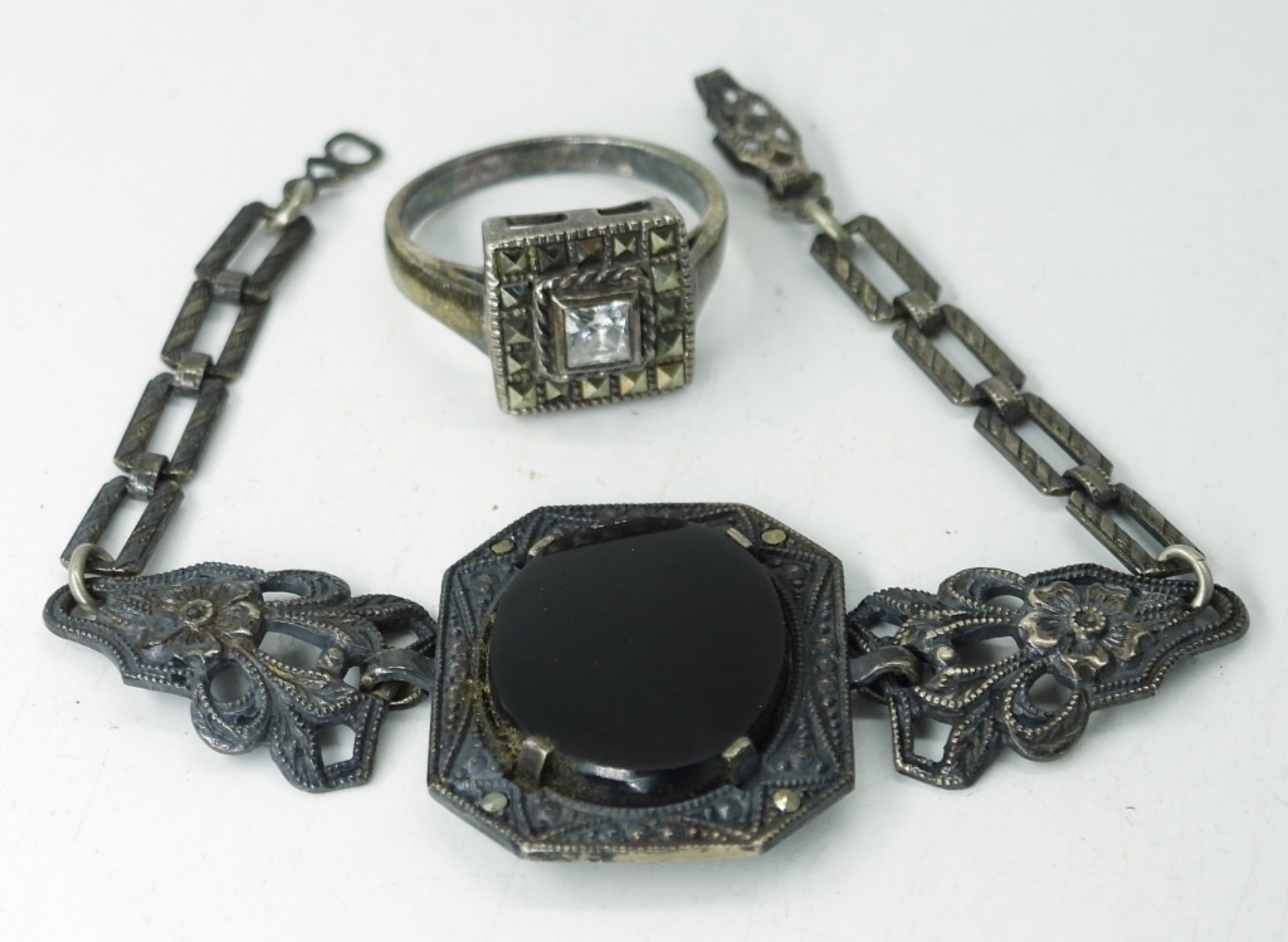 ANTIQUE STERLING BRACELET WITH BLACK GEMSTONE, 6″. VERY PETITE! PRETTY STERLING RING WITH CLEAR GEMSTONE AND MARCASITE, SIZE 7. 8 DWT