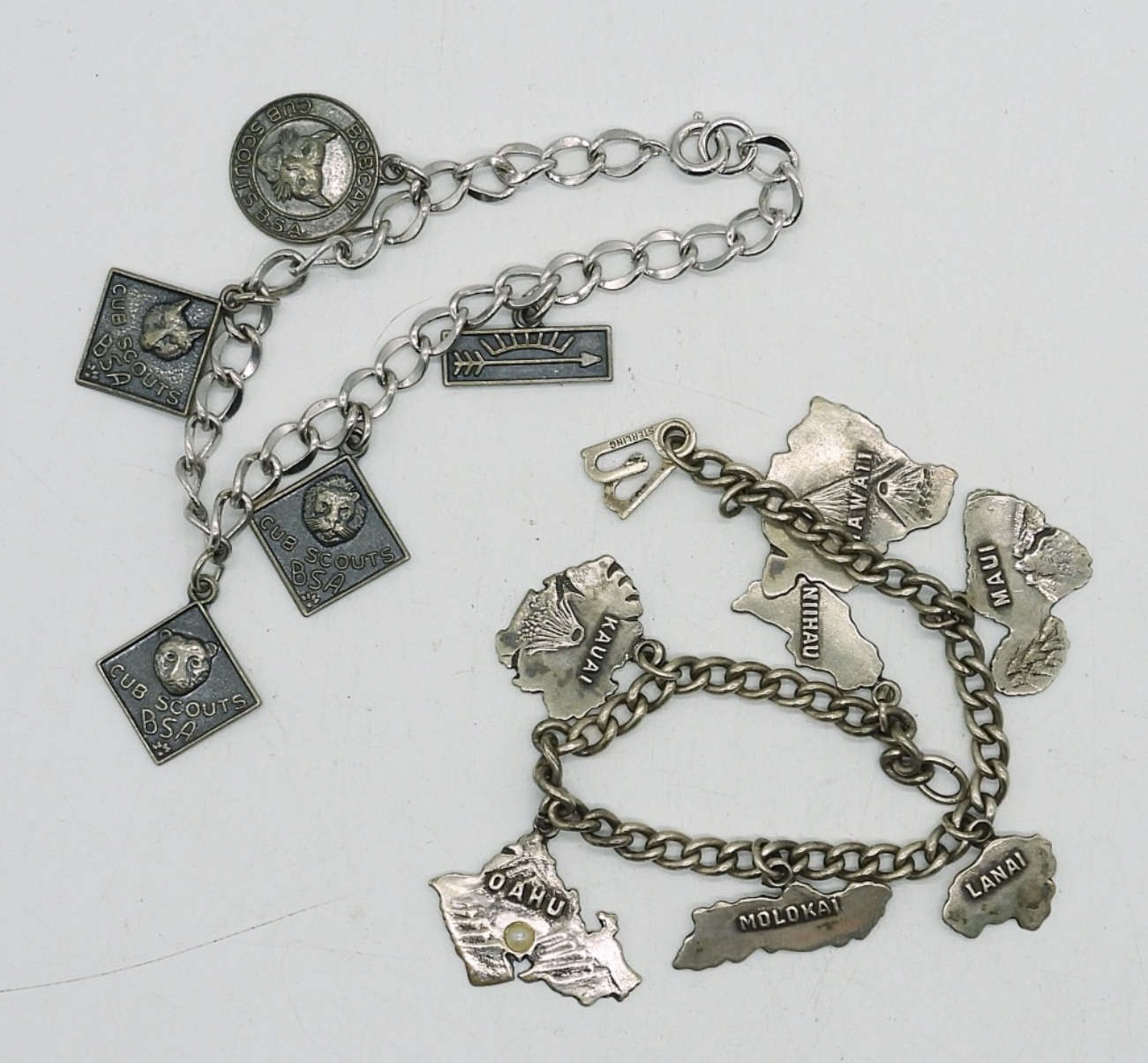 BOY SCOUT STERLING CHARM BRACELET, 5 CHARMS. HAWAIIAN ISLANDS STERLING CHARM BRACELET, 7 CHARMS. 24.1 DWT