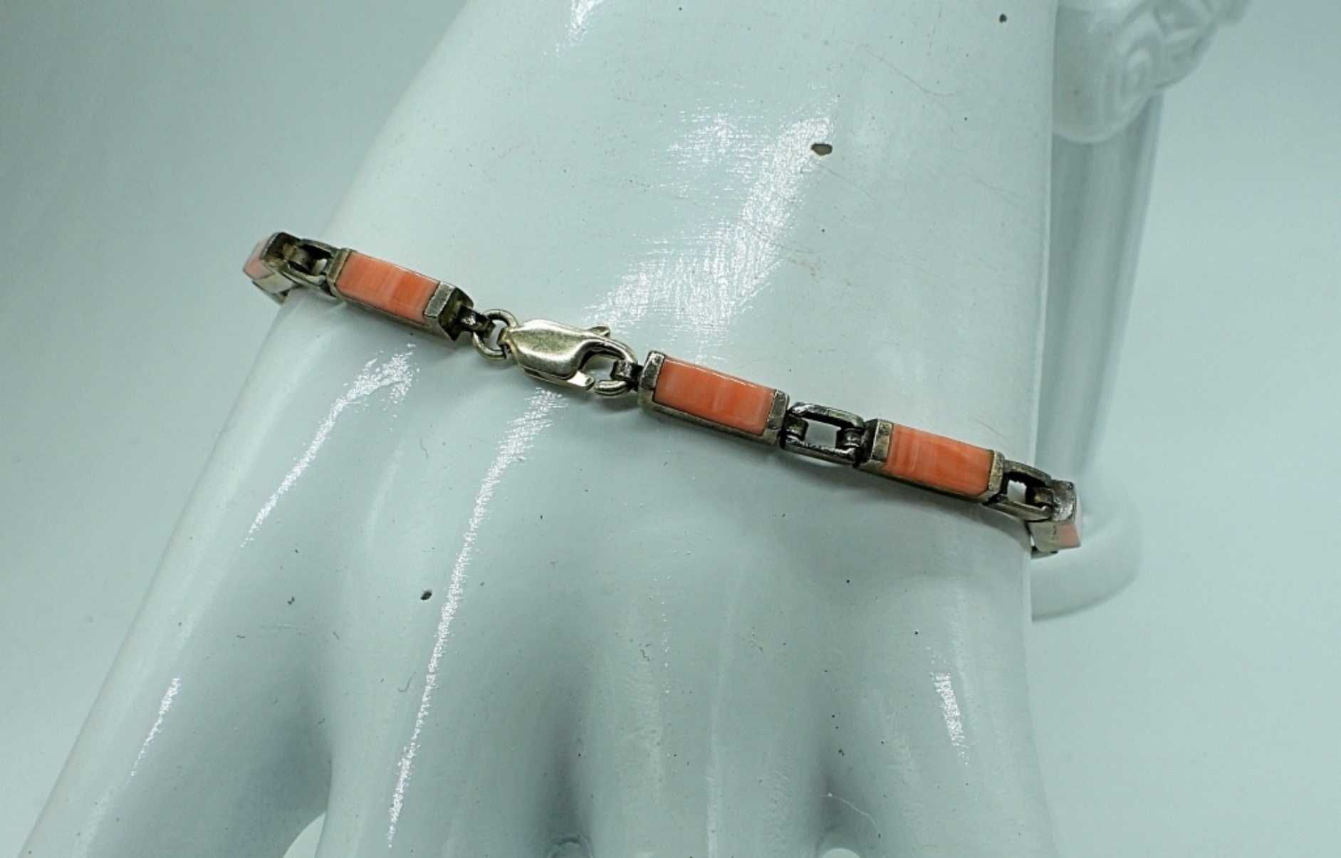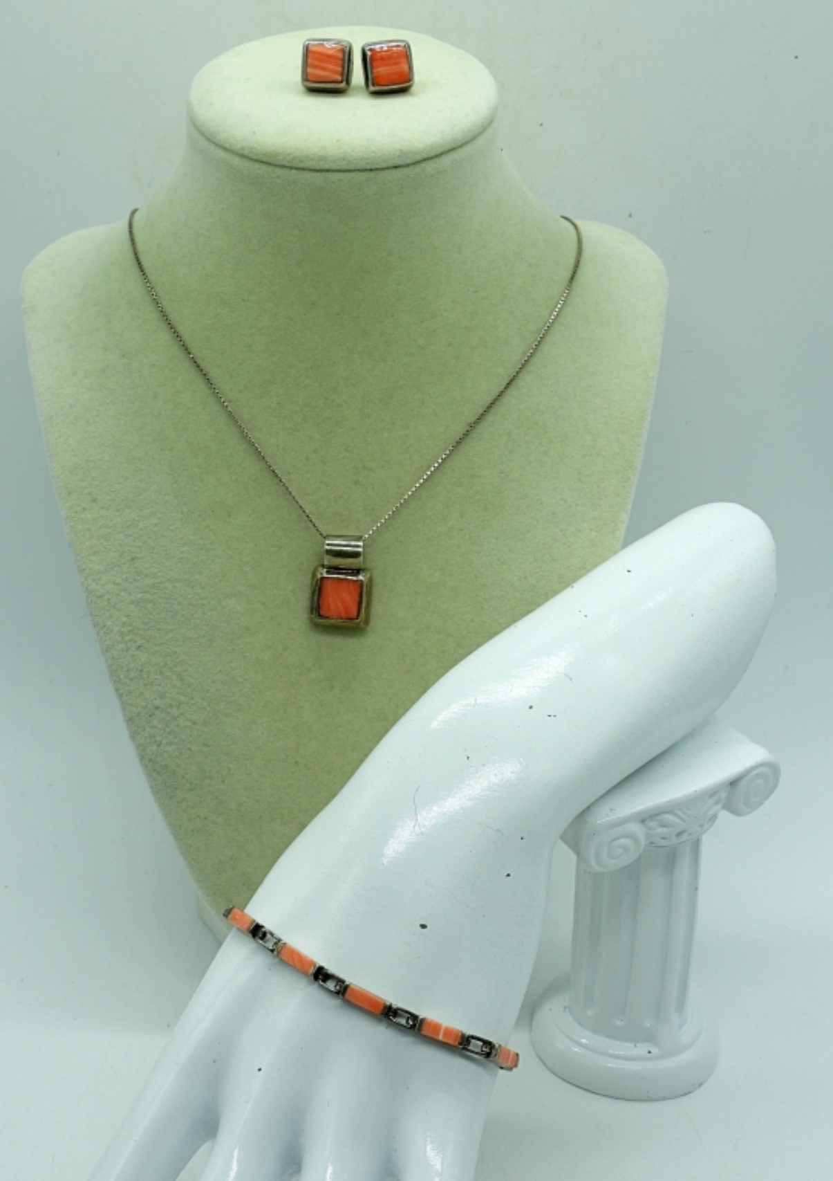 3 PIECE STERLING PINK CORAL SET, MEXICO 925. STERLING CHAIN IS 24″. BRACELET IS 7-8″. PIERCED EARRINGS. 19.1 DWT