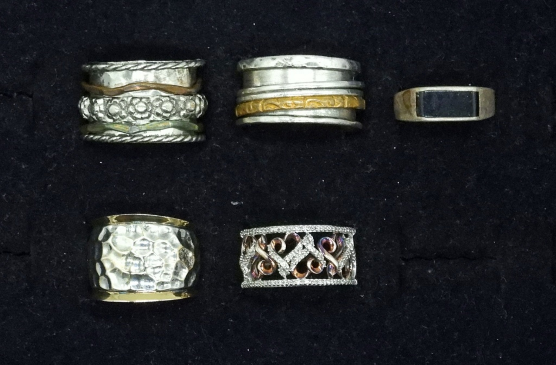 FIVE STERLING RINGS, VINTAGE. TWO ARE FIDGET RINGS. SIZES 6-9.5. 23.2 DWT
