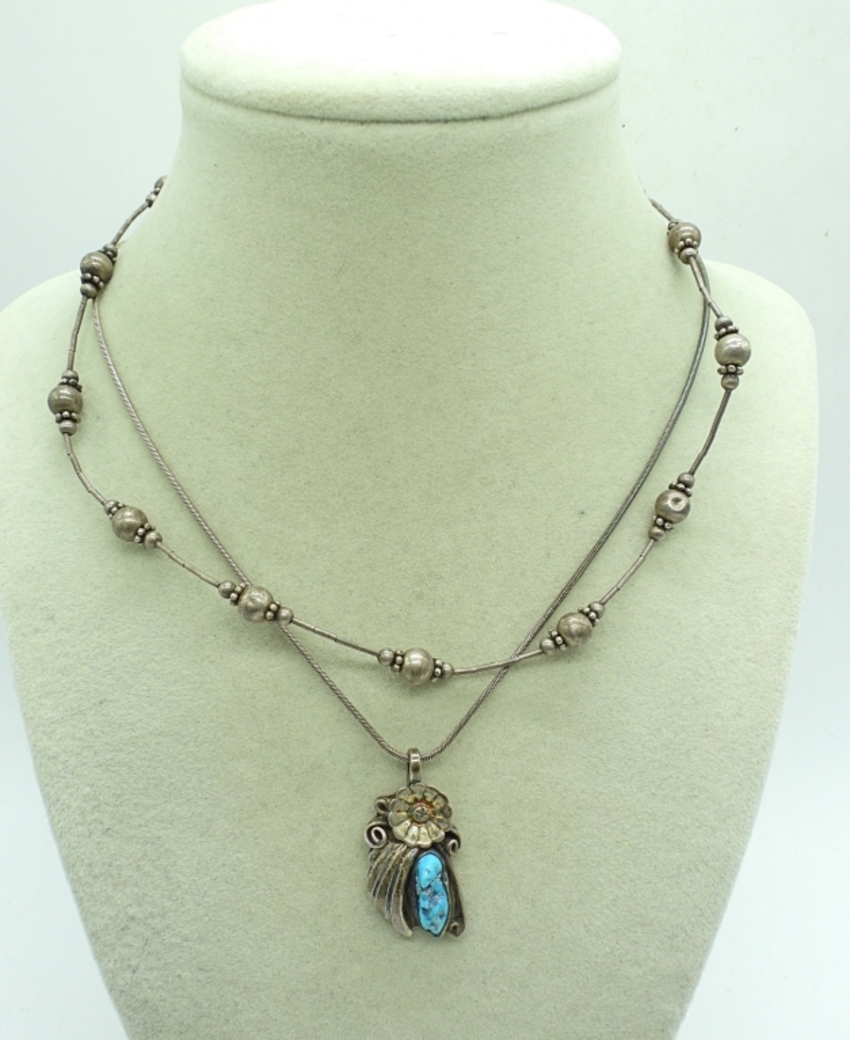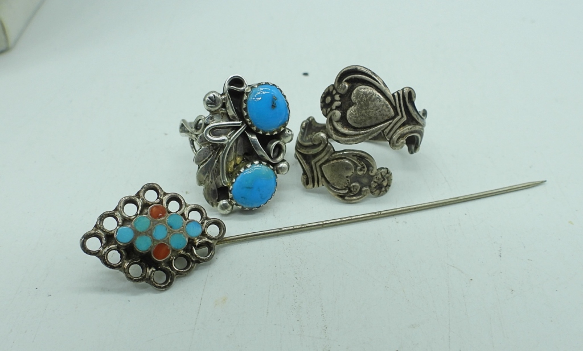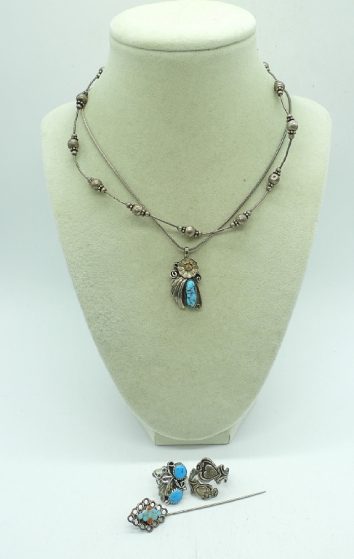 VINTAGE STERLING SILVER & TURQUOISE GEMSTONES. NECKLACES ARE 16″ & 18″. RINGS SIZE 5. STICKPIN 3″. 19.4 DWT