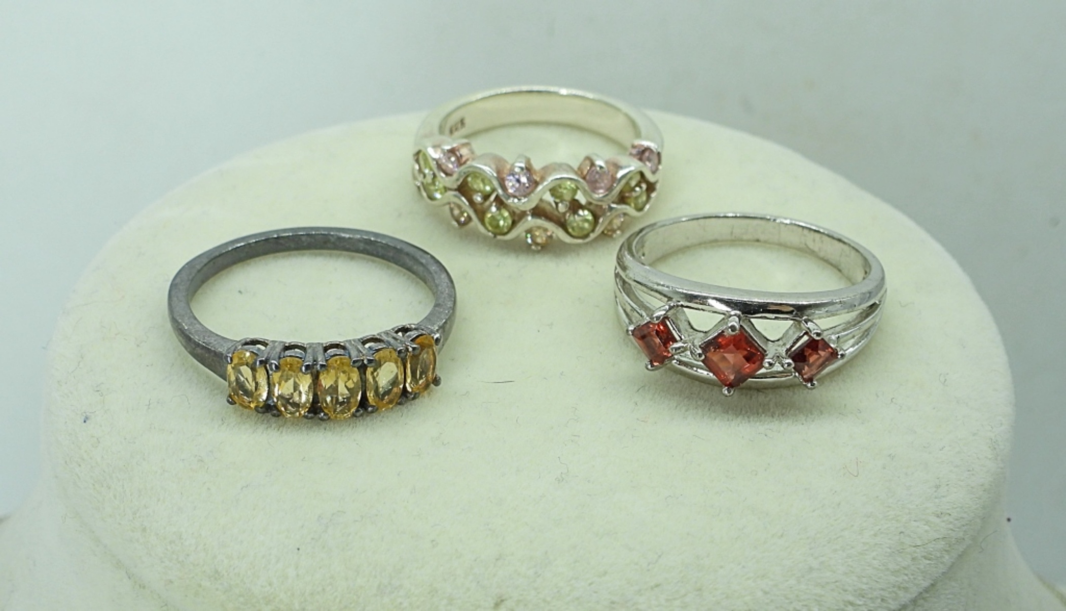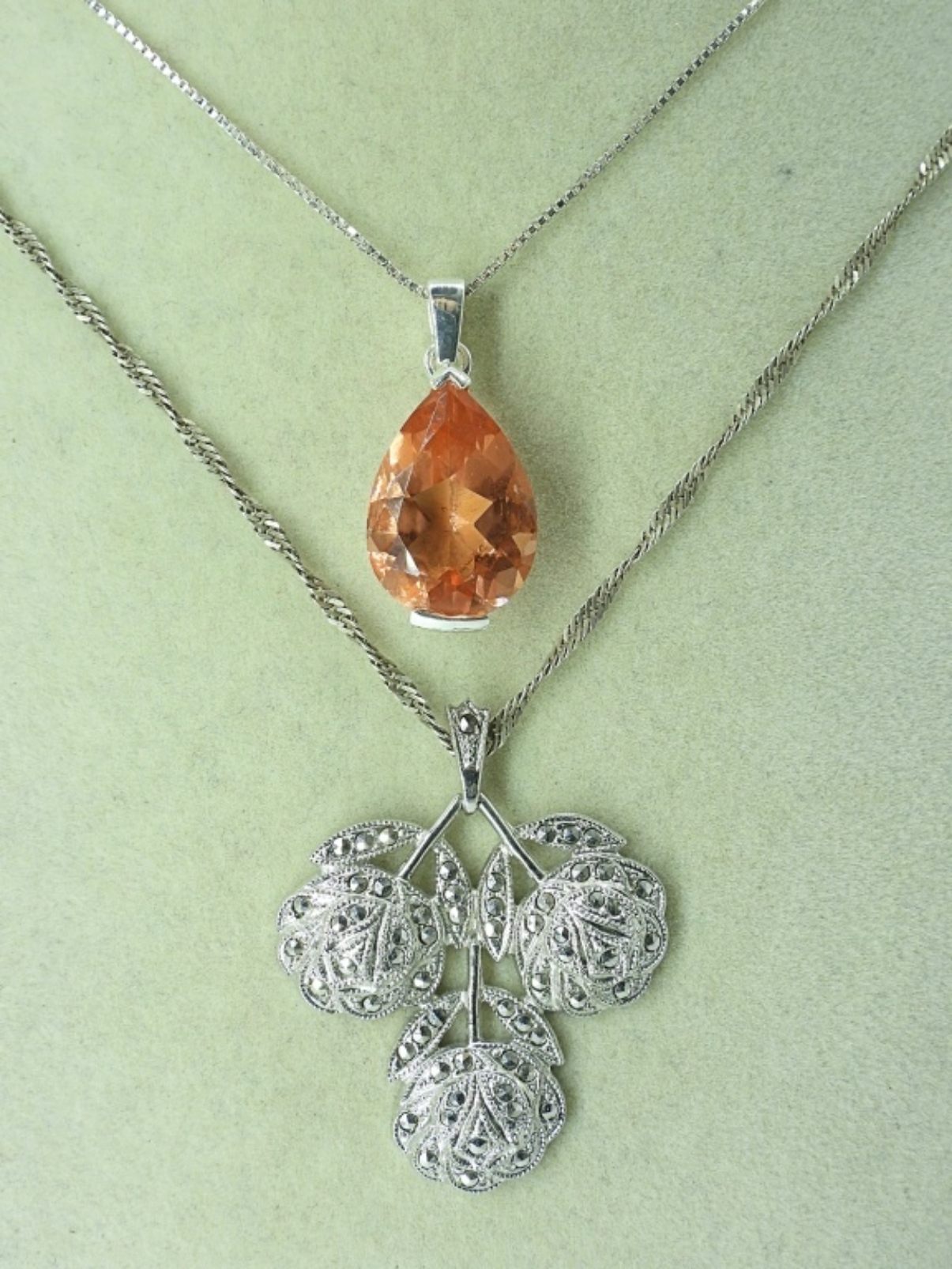 STERLING CHERRY PENDANT WITH MARCASITE ON A 24″ STERLING CHAIN. PEACH COLORED GEMSTONE PENDANT ON AN 18″ STERLING CHAIN. 3 GEMSTONE RINGS, SIZES 7, 8, 9. 17 DWT