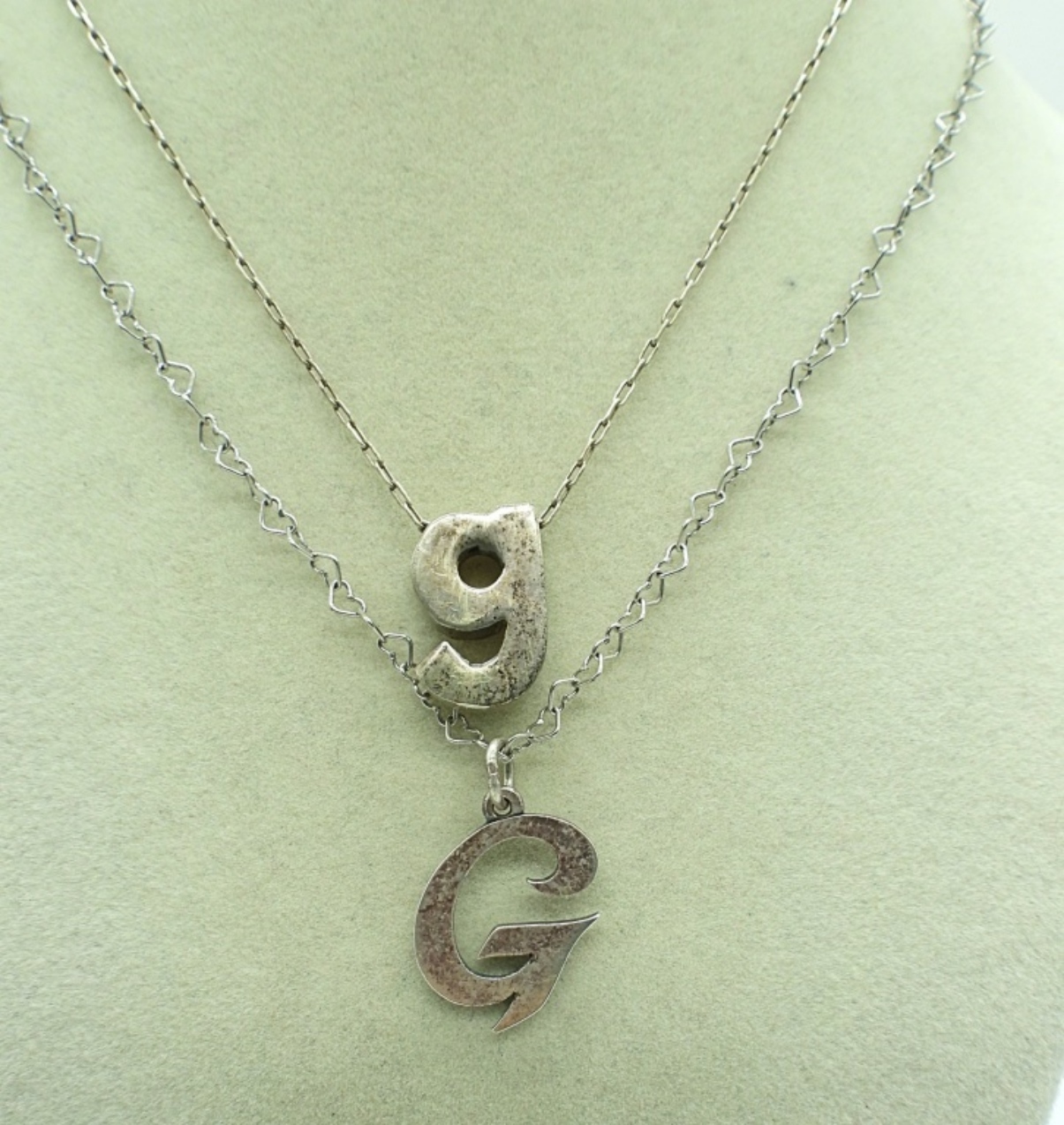 CAPITAL G PENDANT ON AN 18″ HEART CHAIN. LOWER CASE G PENDANT ON A 15″ STERLING CHAIN. BOTH TARNISHED. 7 DWT
