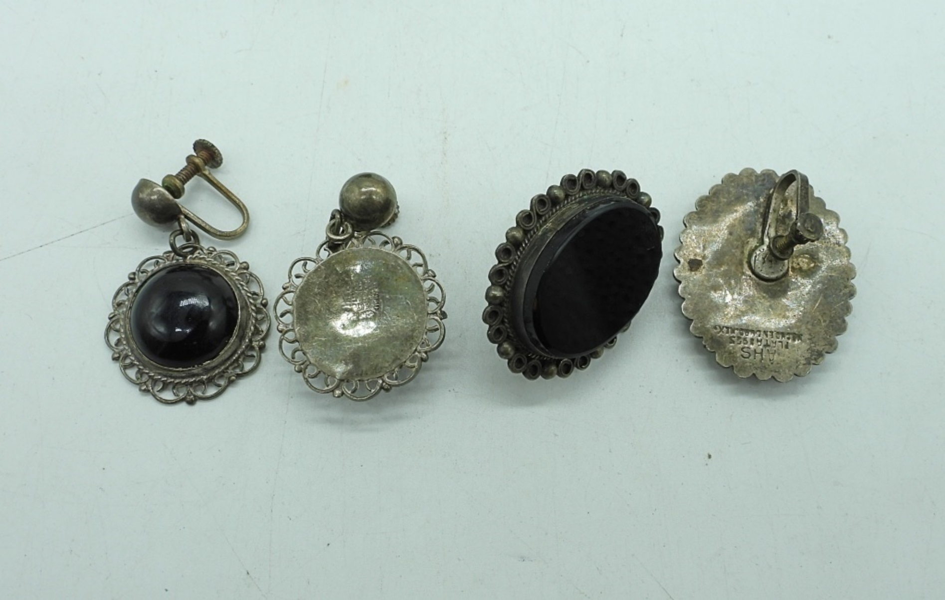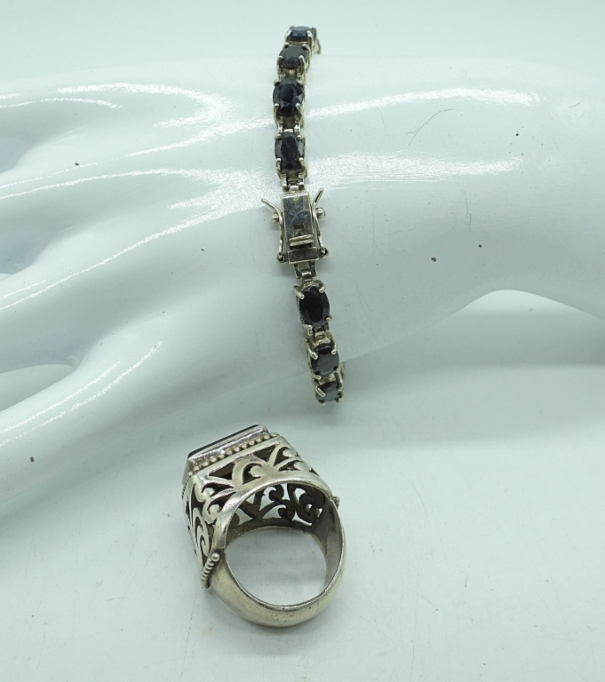 VINTAGE STERLING MEXICO SCREW BACK EARRINGS-2 PAIR. RING SIZE 6. BLACK GEMSTONE BRACELET, 7″. 31.1 DWT