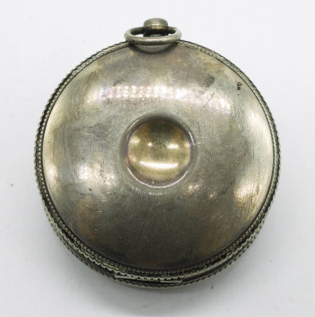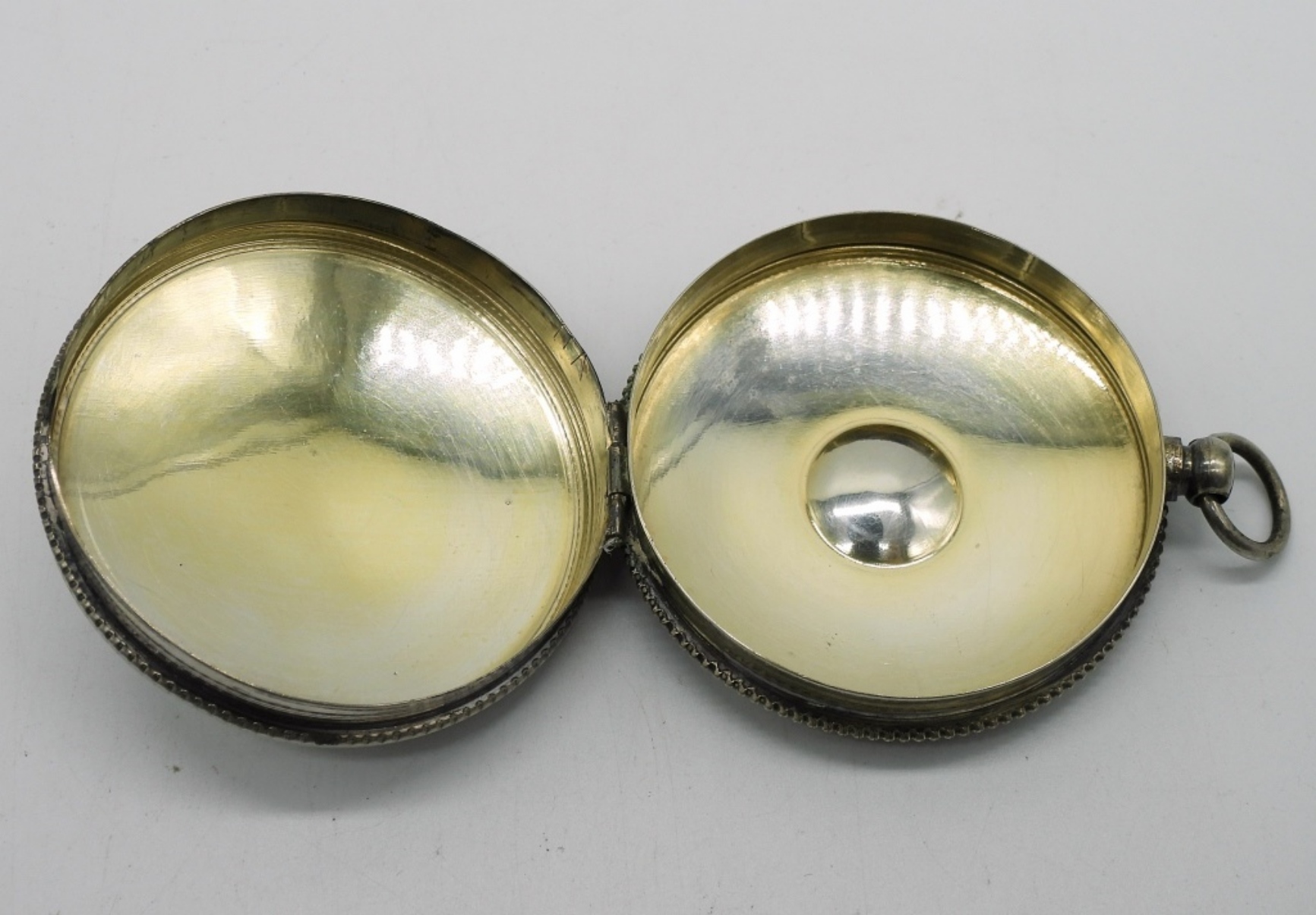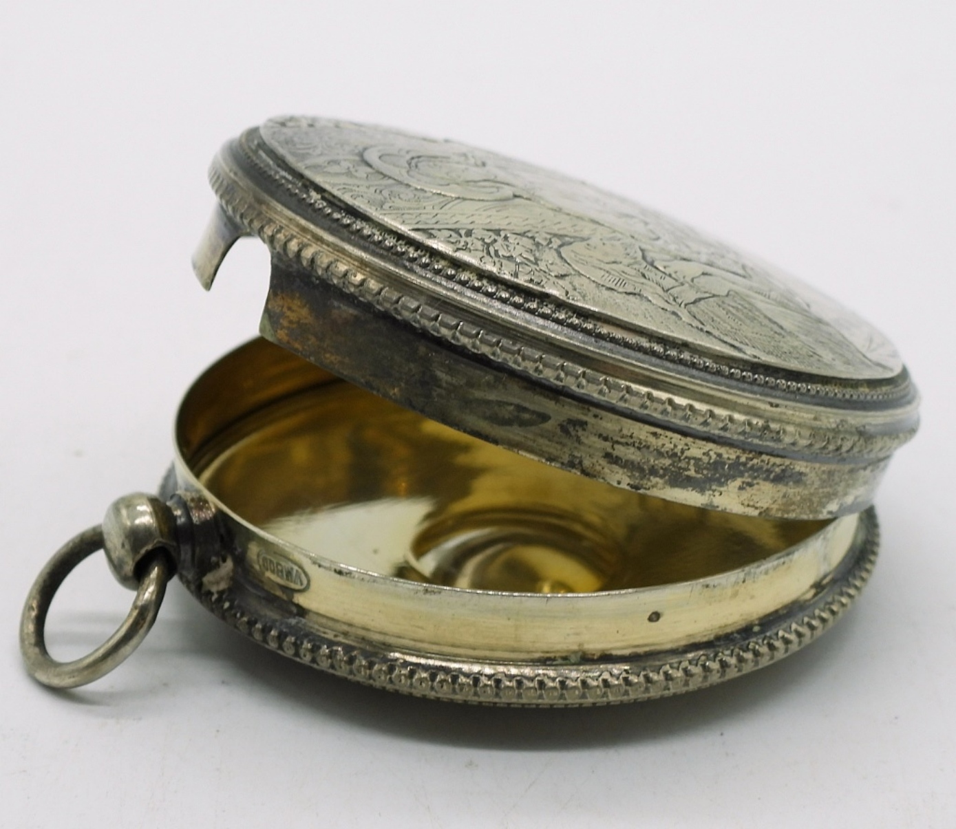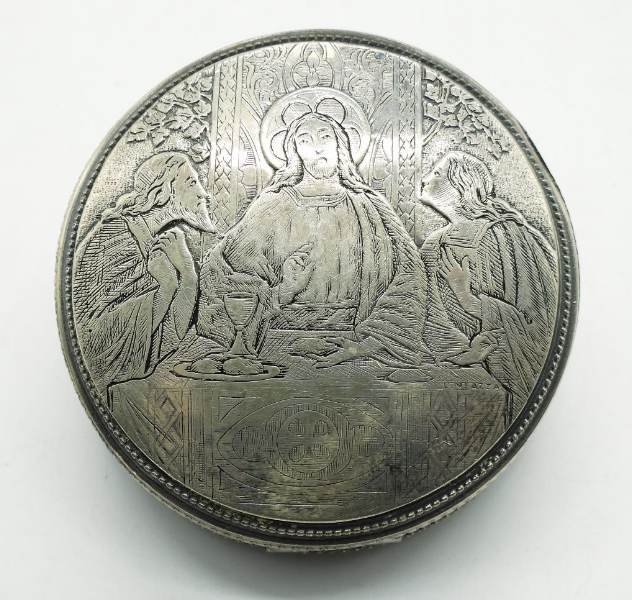 ROUND TRINKET BOX, WITH A RELIGIOUS JESUS SCENE ETCHED ON THE FRONT. 2.5″. 35.8 DWT