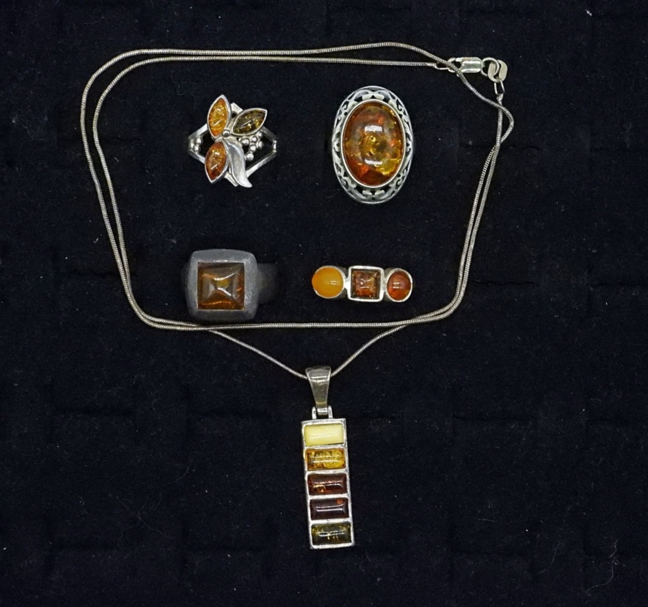 FOUR AMBER RINGS IN STERLING, SIZES 7 & 8. AMBER NECKLACE, STERLING CHAIN 20″. 20 DWT