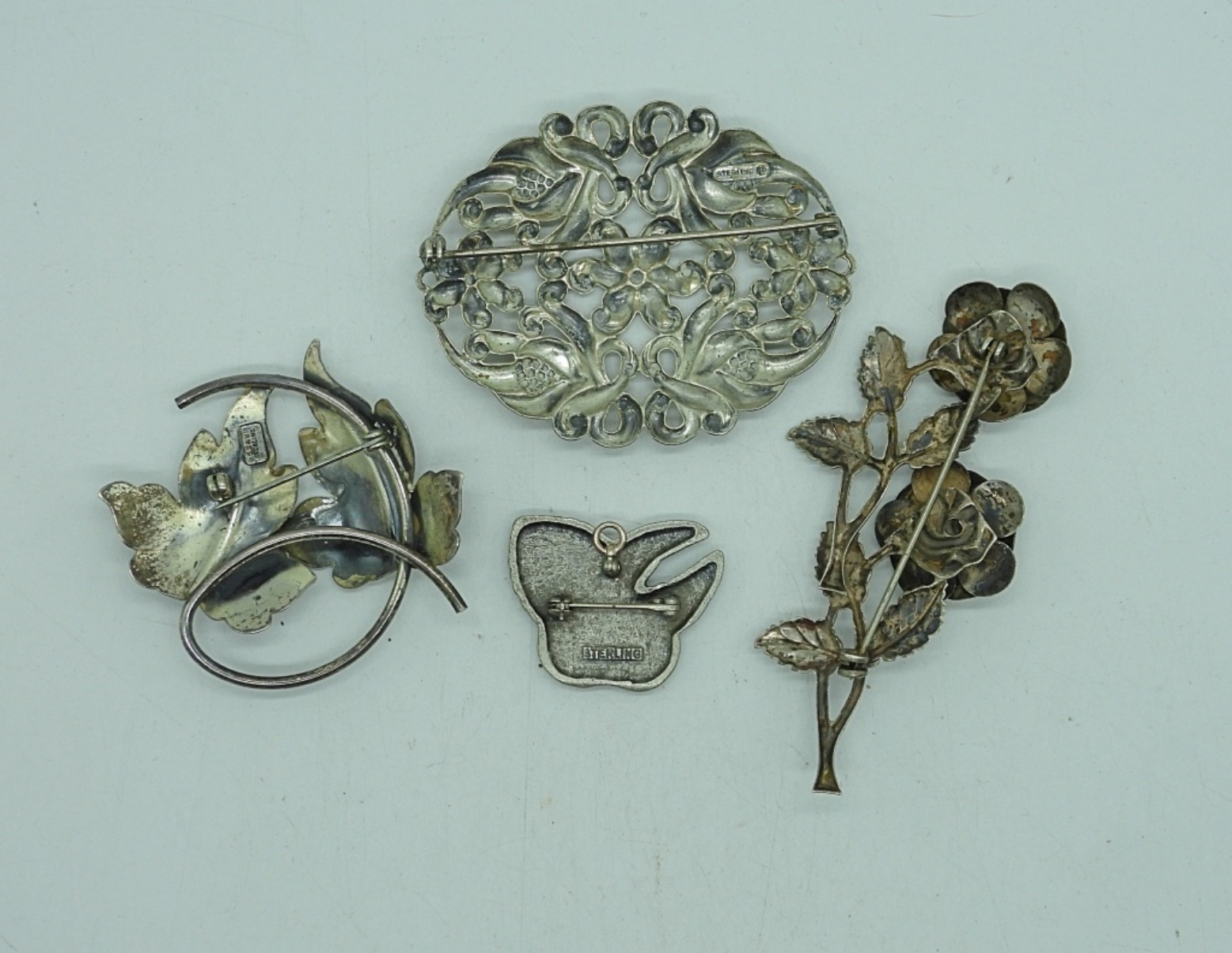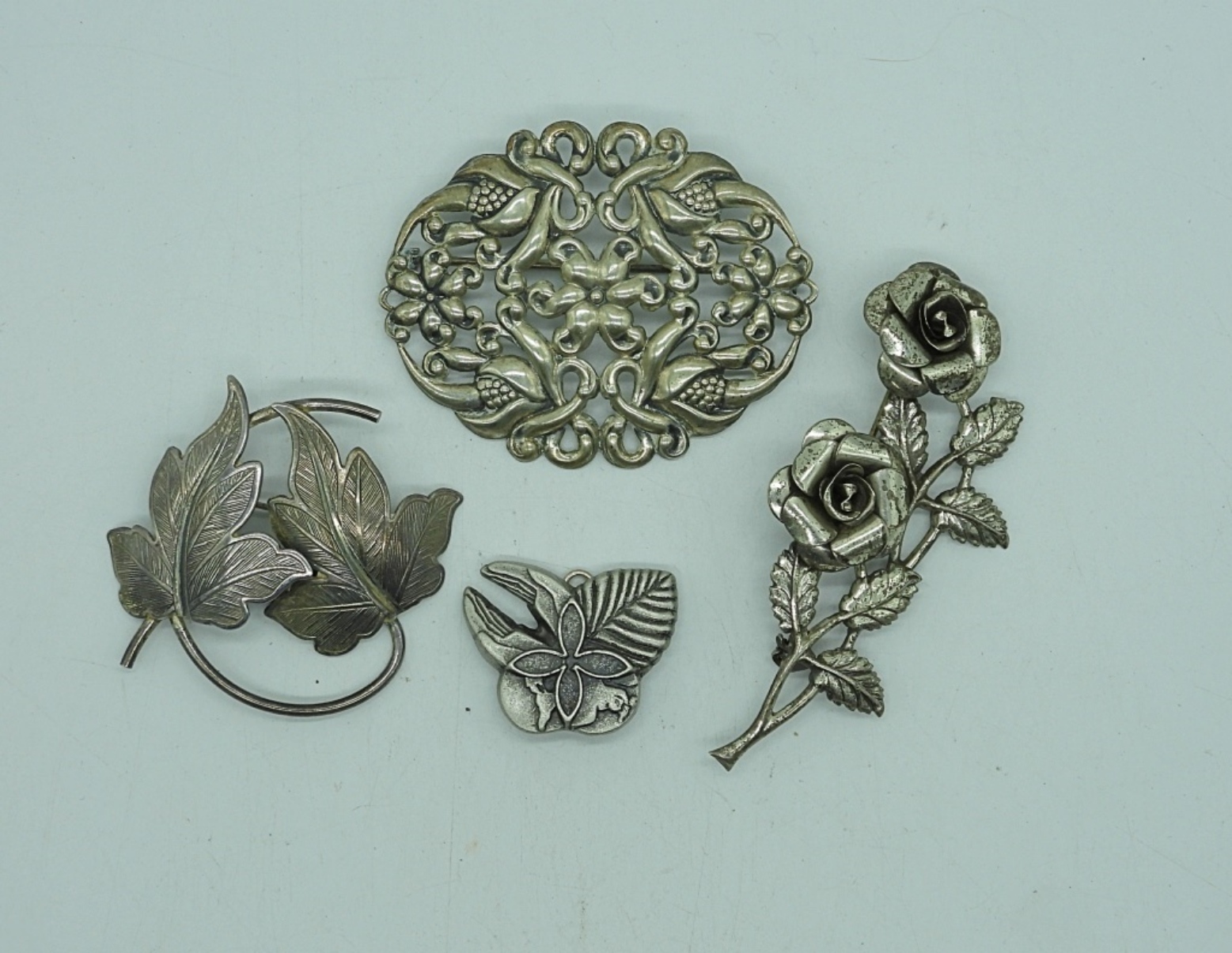 FOUR VINTAGE STERLING SILVER BROOCHES. 1″-3″. 26.5 DWT