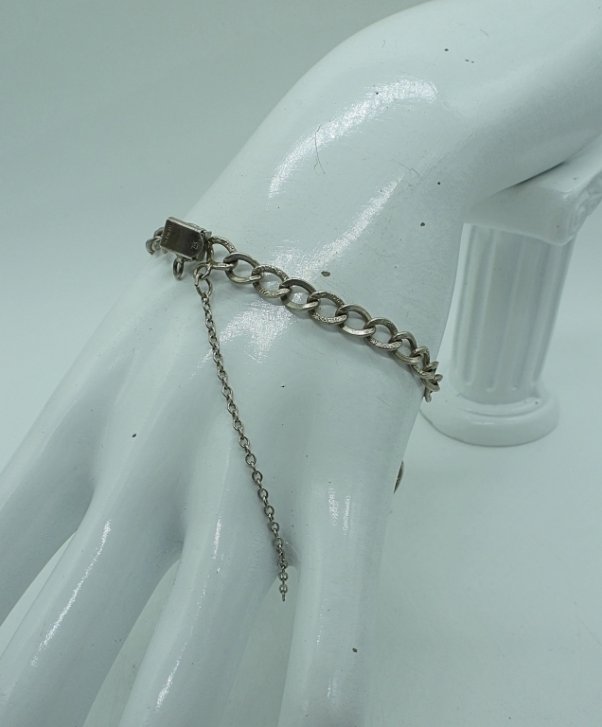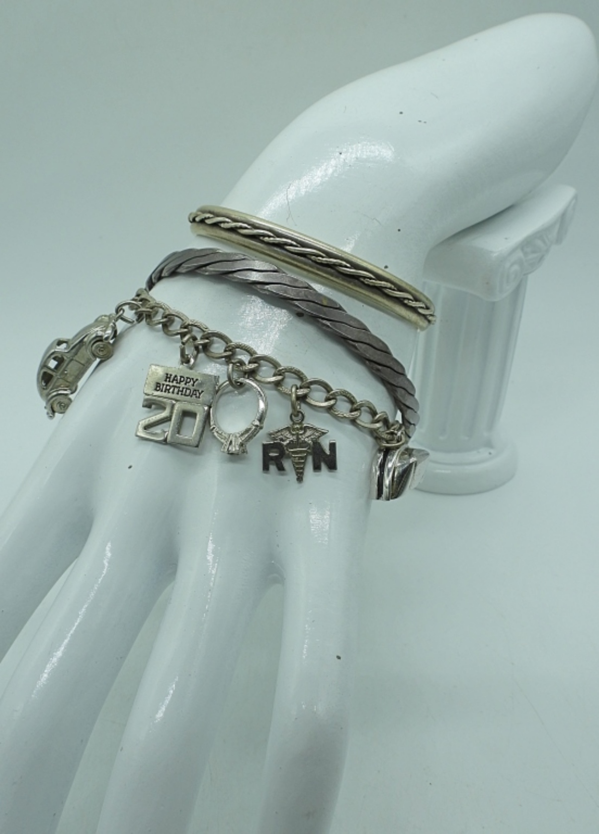 THREE STERLING SILVER BRACELETS. CHARM BRACELET WITH 5 CHARMS 7″. OTHER BRACELETS ARE 7-8″. 35.5 DWT