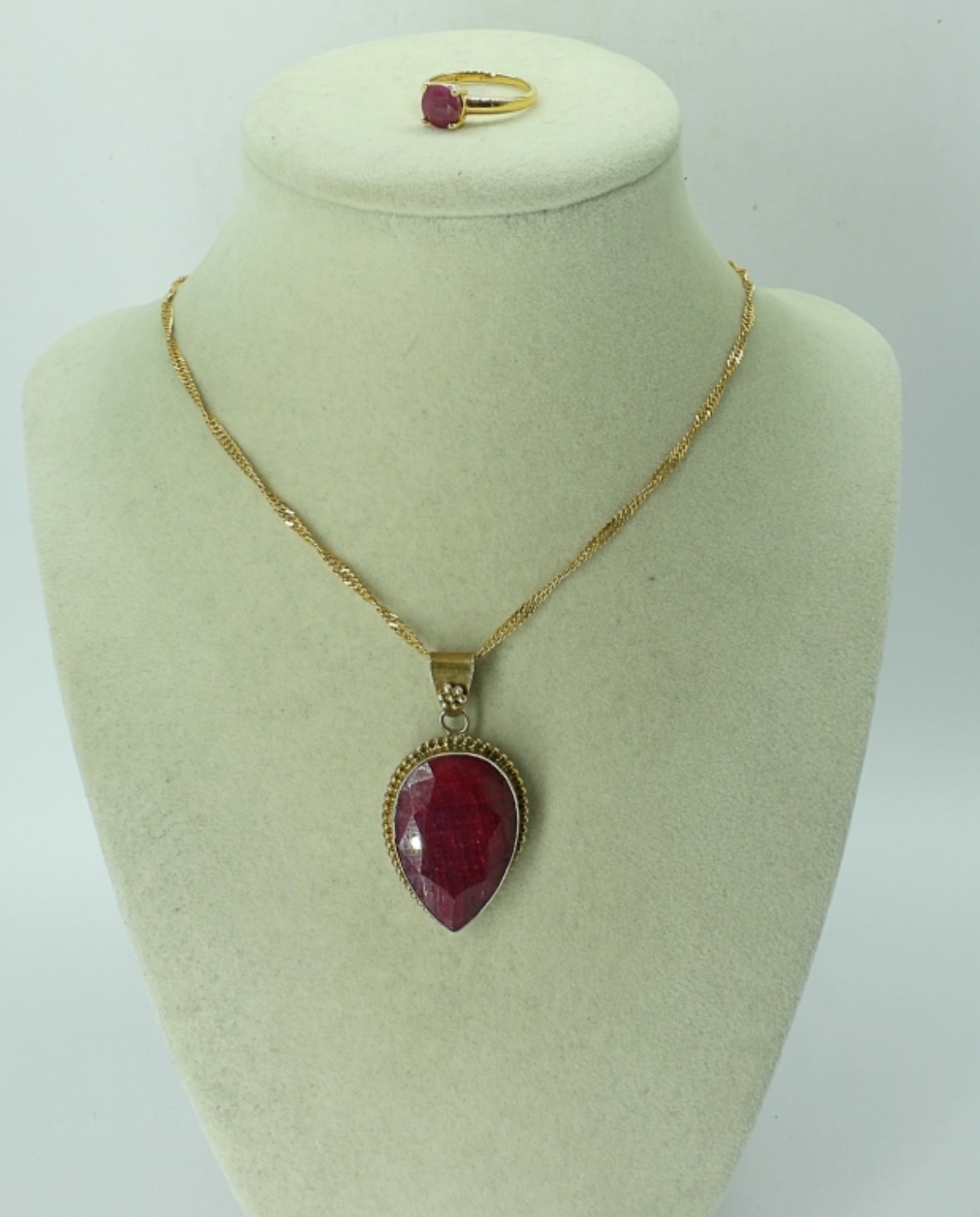 GOLD TONE STERLING SILVER NECKLACE & RING WITH NATURAL RUBIES! EVERYTHING IS MARKED 925. RING SIZE 7. CHAIN IS 18″. 11.3 DWT