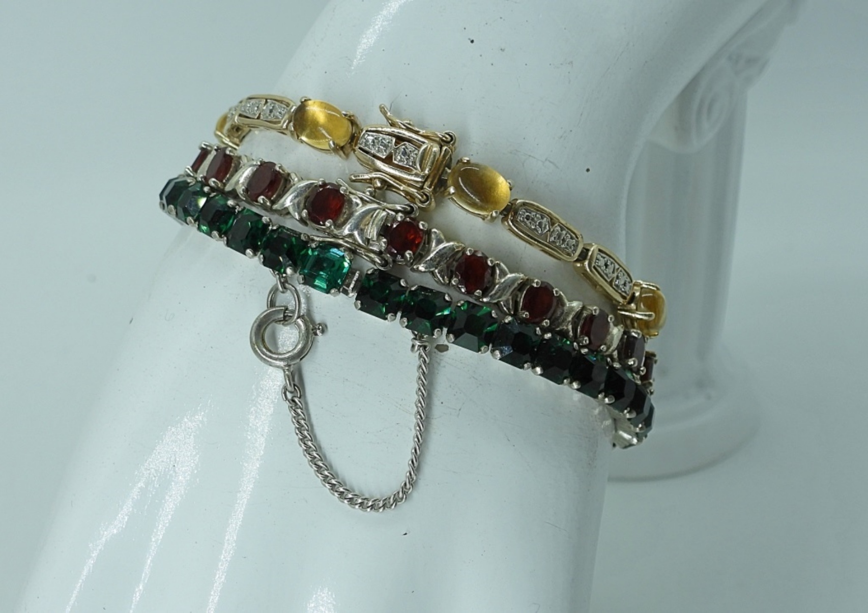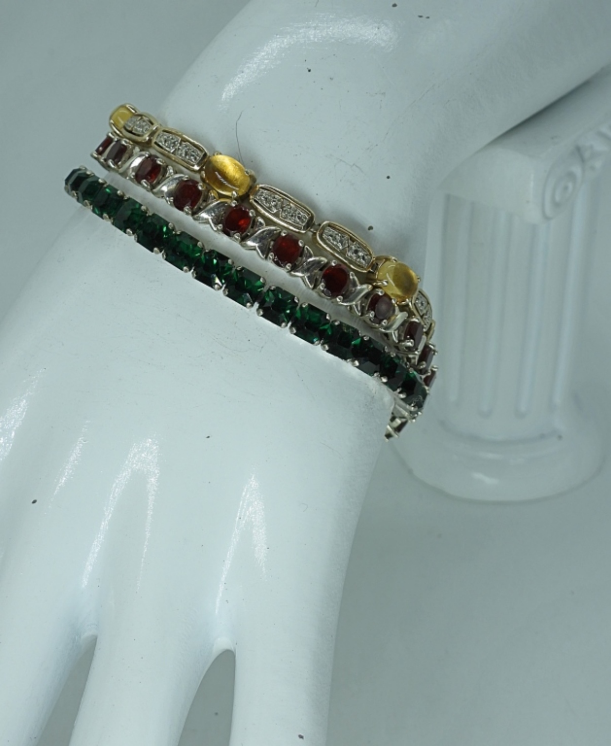 THREE STERLING GEMSTONE TENNIS BRACELETS. 7 & 7 INCHES. 23.5 DWT