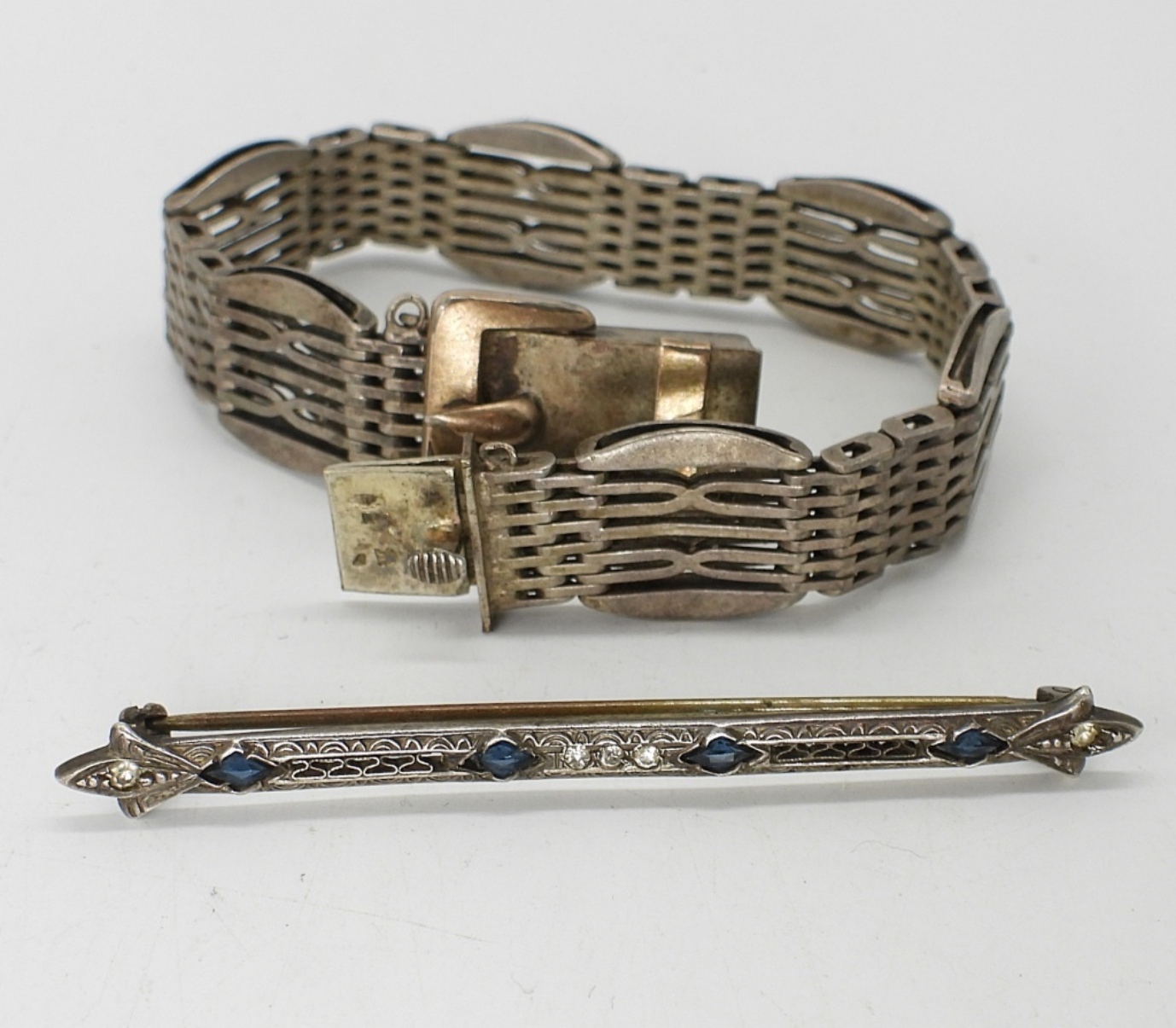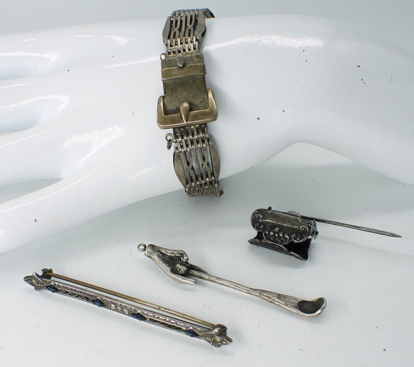ODD AND INTERESTING VINTAGE STERLING JEWELRY. BELT BUCKLE BRACELET, 8″. STICK PIN WITH A CLIP? PRETTY BROOCH WITH BLUE GEMSTONES, 2.5″. ODD SPOON/HAND PENDANT, 2.5″. 17DWT
