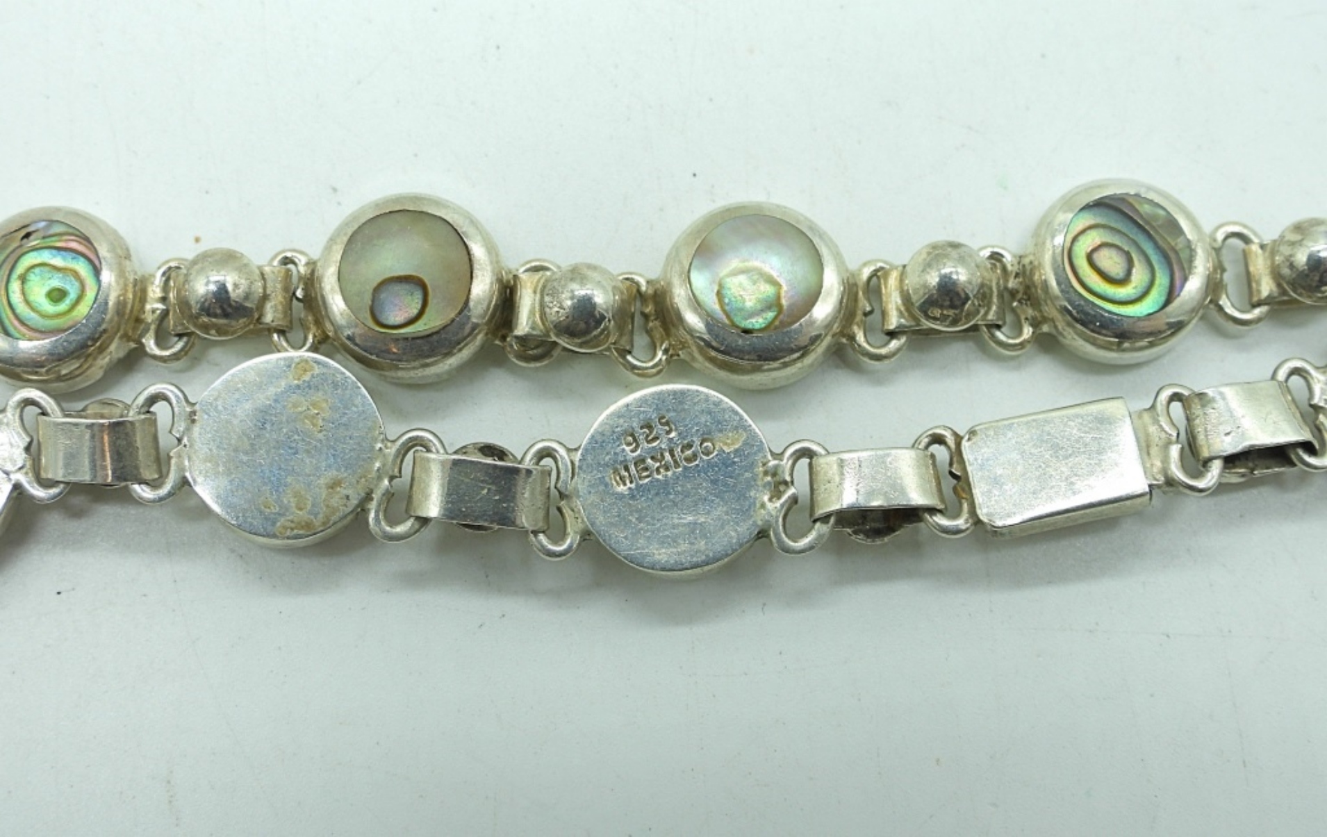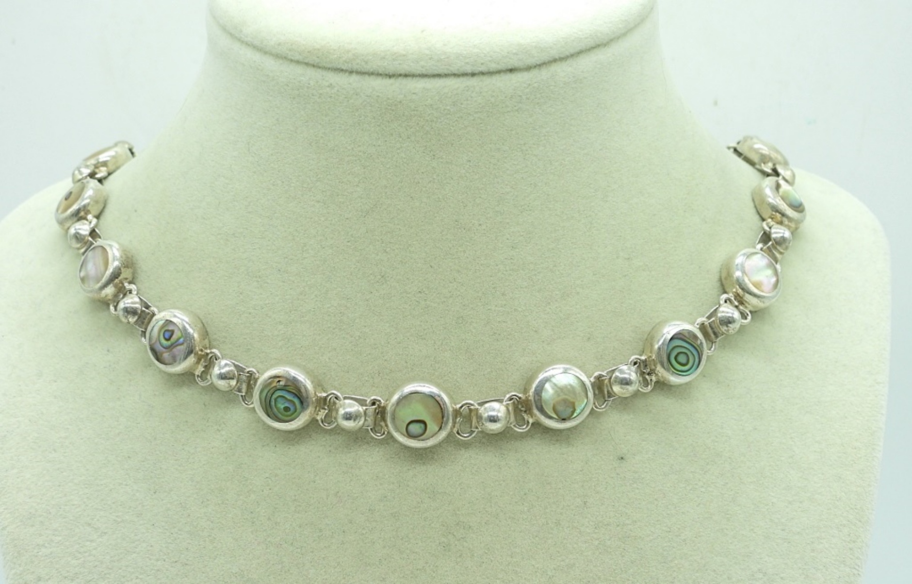 17″ STERLING MEXICO NECKLACE WITH ABALONE SHELL INLAY. 37.6 DWT